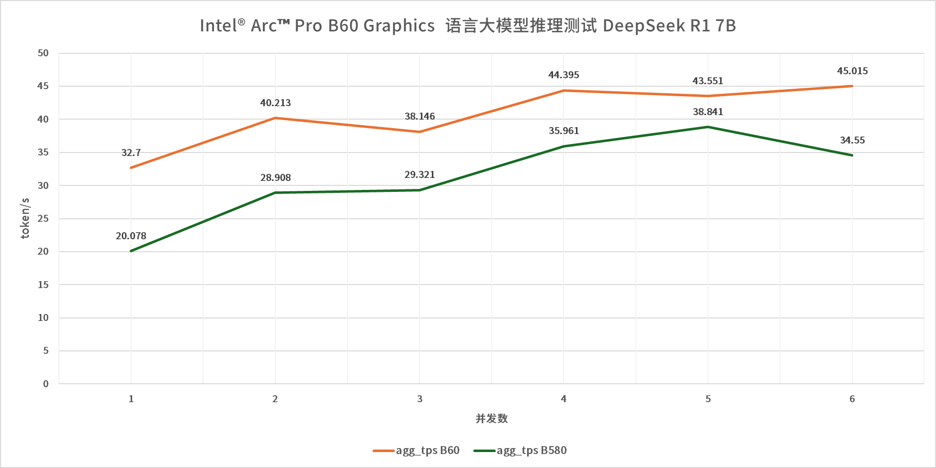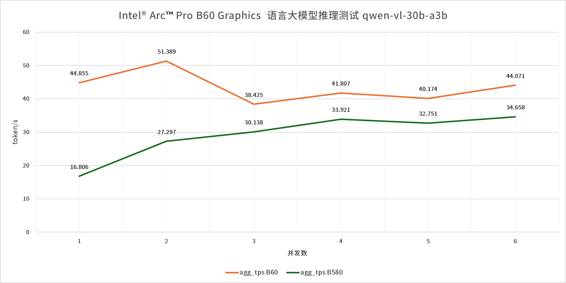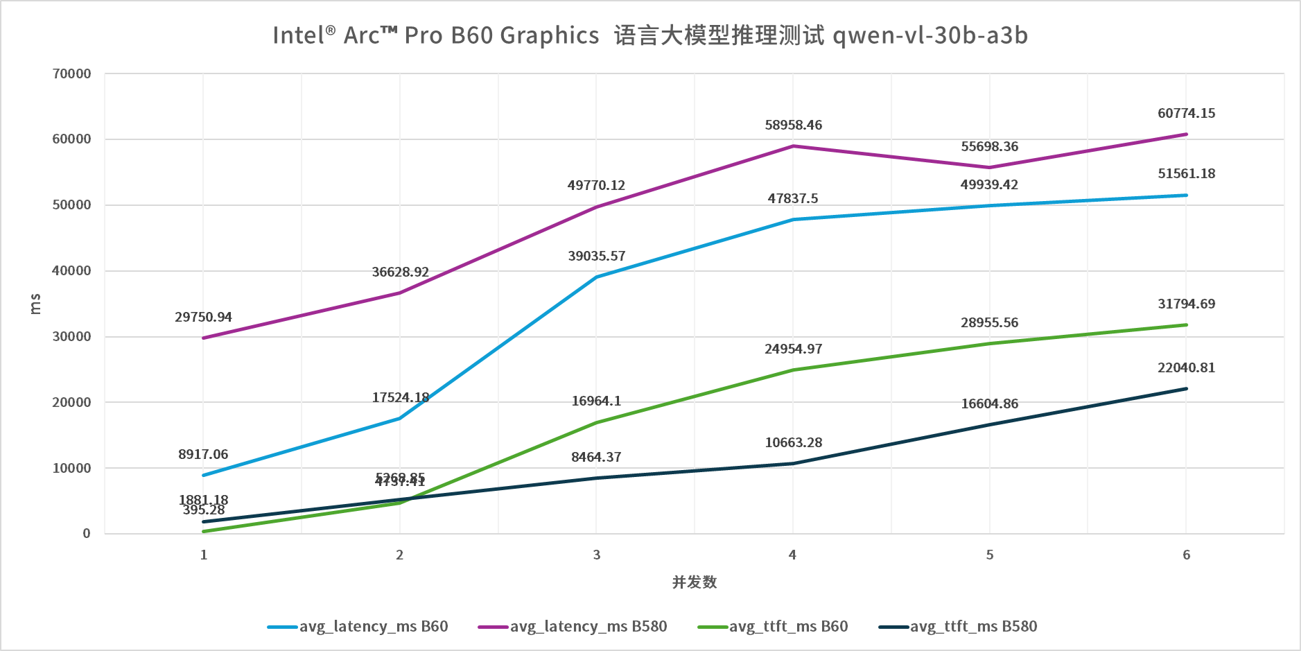 测试结果清晰展现了24GB大显存的核心优势:在DeepSeek R1 7B模型测试中,无论并发数量多少,Arc Pro B60的推理速率均大幅领先Arc B580,领先幅度稳定在20%-30%之间,首字延迟(TTFT)与平均推理延迟也显著优于后者。更换参数规模更大的gpt-oss-20B模型、qwen-vl-30b-a3b MOE模型后,测试结果基本一致,随着模型参数规模的提升,Arc Pro B60的领先优势进一步凸显,而Arc B580则因为显存容量的限制,在高并发、大参数模型场景中,出现了明显的性能衰减与延迟飙升。