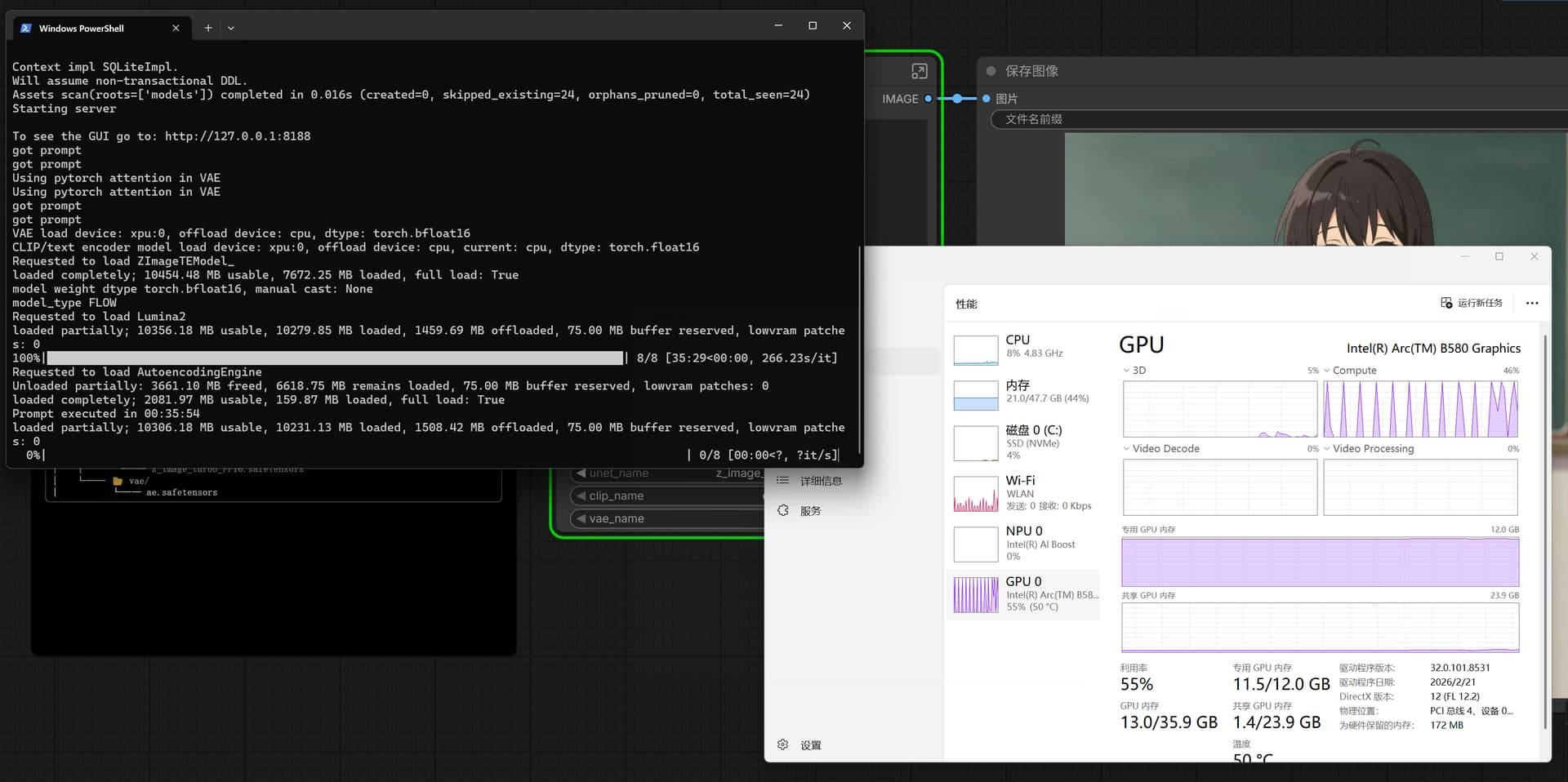 而12GB显存的Arc B580,在使用BF16全精度模型时会直接出现显存溢出,8步生成单张图片耗时长达35分钟,基本处于不可用状态。