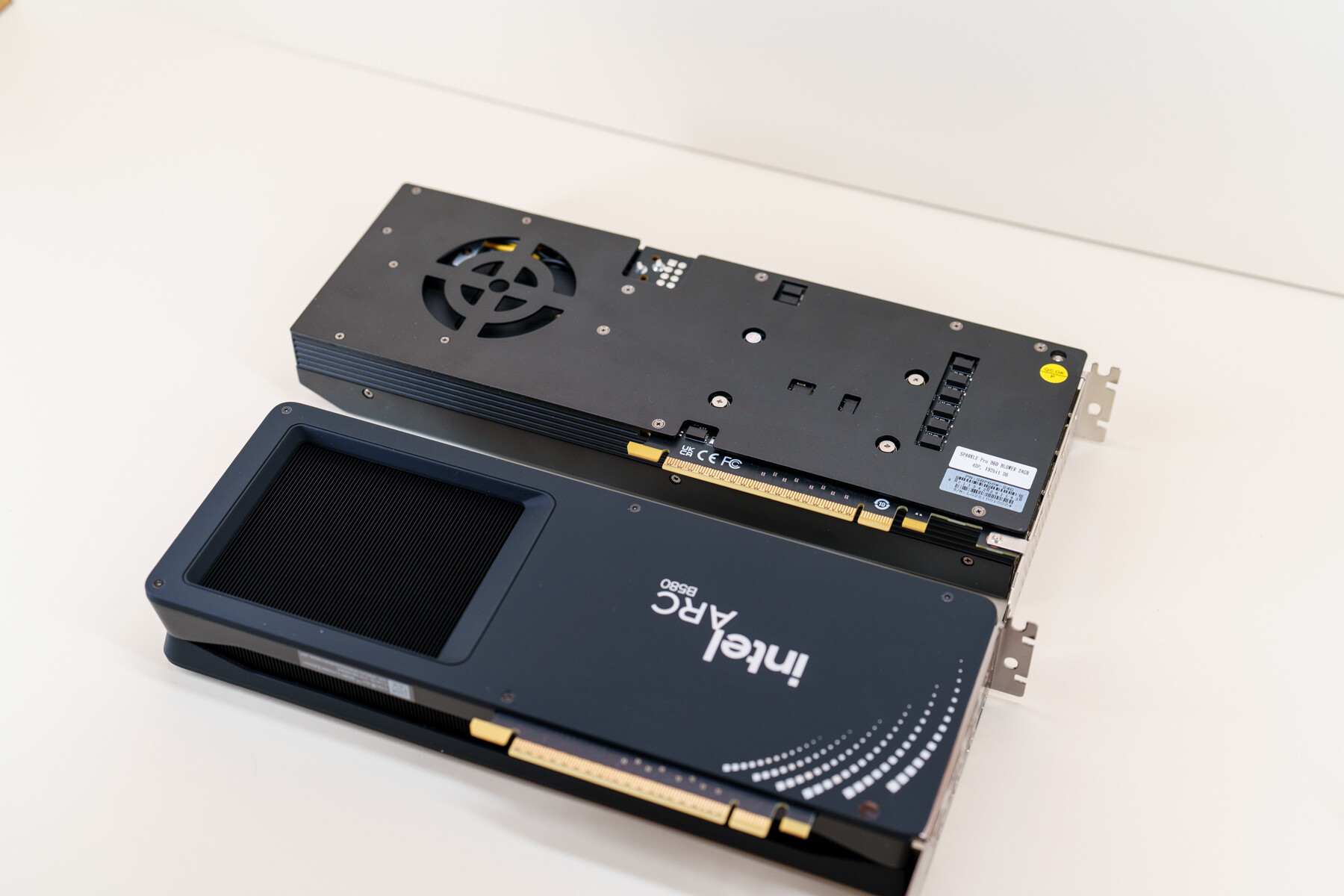 作为一款面向专业工作站场景打造的显卡,Intel Arc Pro B60的工业设计完全围绕“工作站场景刚需”展开,从板型、散热、供电到接口配置,都与消费级定位的Arc B580形成了极其鲜明的定位区分,也处处体现着专业显卡的设计逻辑。