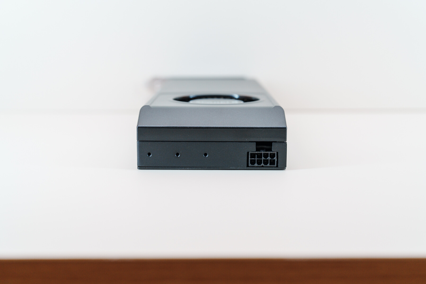 值得一提的是,这款显卡的供电接口设计在了显卡尾部,而非PCB板侧,这样的设计能够避免供电线接入后导致显卡整体超高,无法适配紧凑型机箱;而显卡PCB并未贯穿至尾部,供电接口通过飞线焊接的方式与PCB连接,在不影响电气性能的前提下,最大化优化了机箱空间适配性。