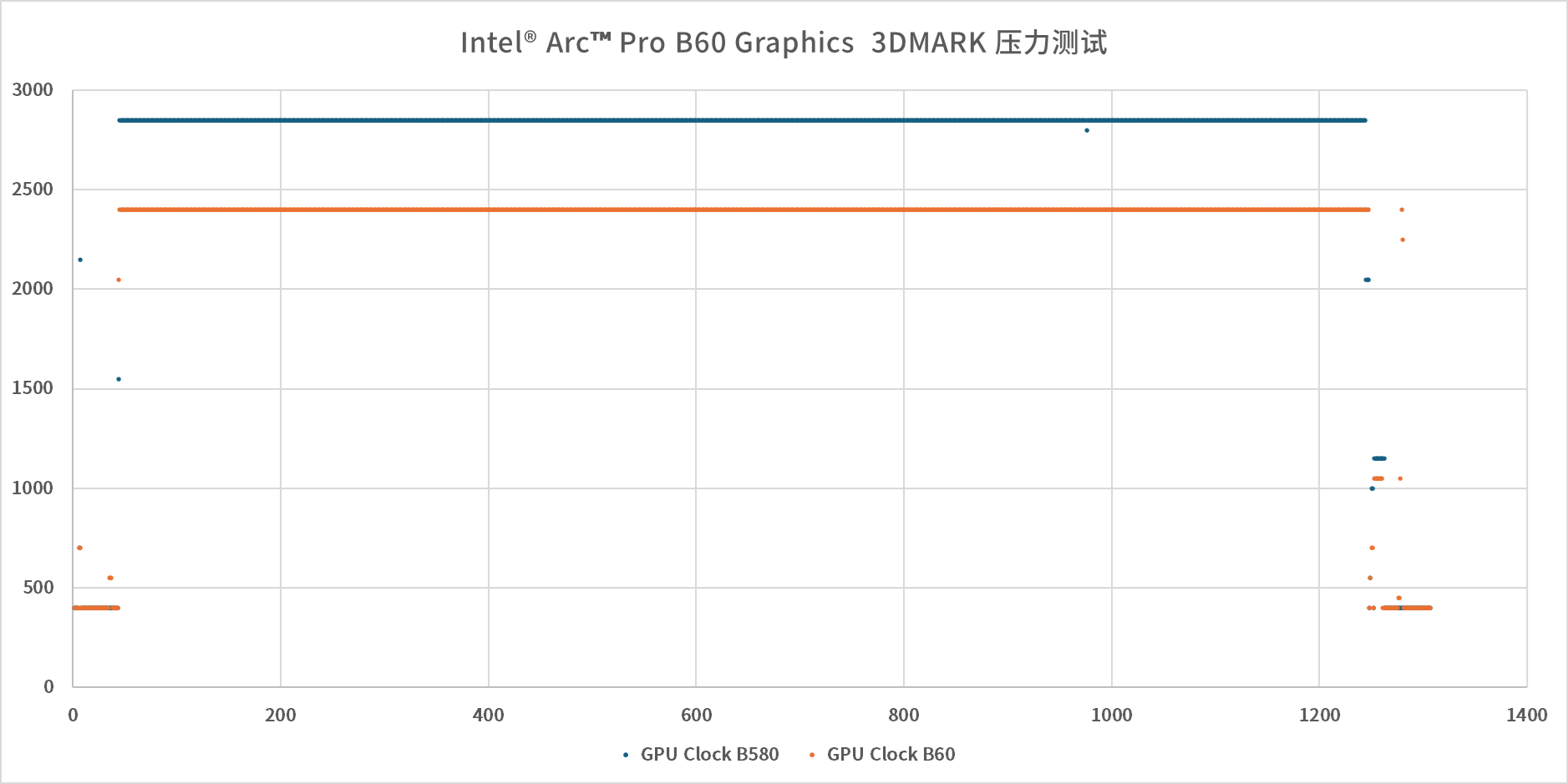 而造成这一性能差距的核心原因,我们通过3DMARK压力测试的全程监控数据得到了清晰的答案:在整个压力测试过程中,Arc B580的GPU核心频率始终稳定在2850MHz,相比官方标称频率实现了约180MHz的超频boost,能够持续输出峰值性能;而Arc Pro B60的核心频率则始终锁定在官方限定的2400MHz,两者450MHz的GPU实际运行频率差距,直接造成了约10%的3D性能差异。