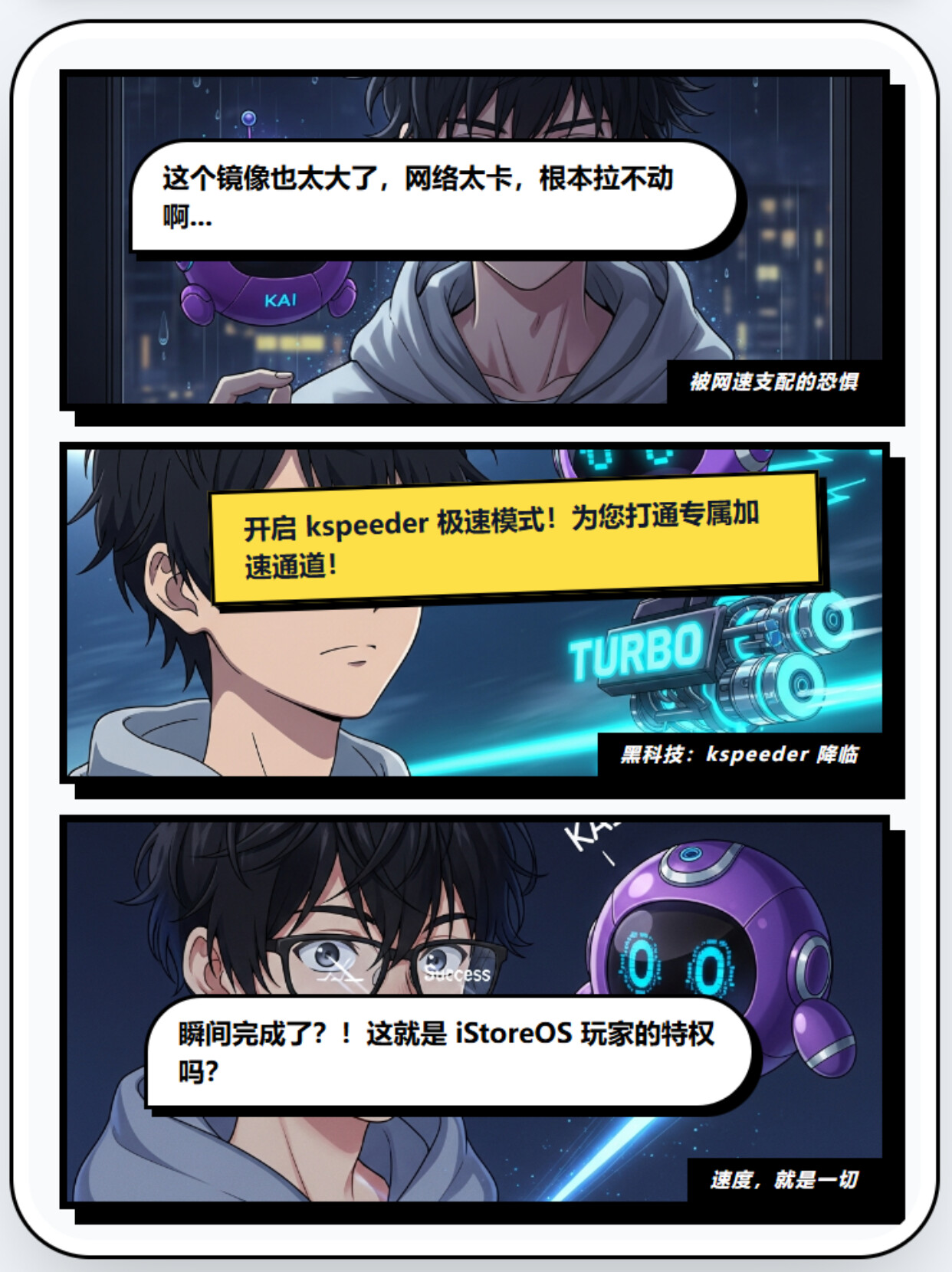 国内拉Docker镜像的痛苦大家都懂。KAI里集成了 kspeeder 模式,开启后相当于走了专属加速通道。漫画里夸张说是“瞬间完成”,实际体验应该是能显著解决因为网络卡顿导致部署失败的问题。