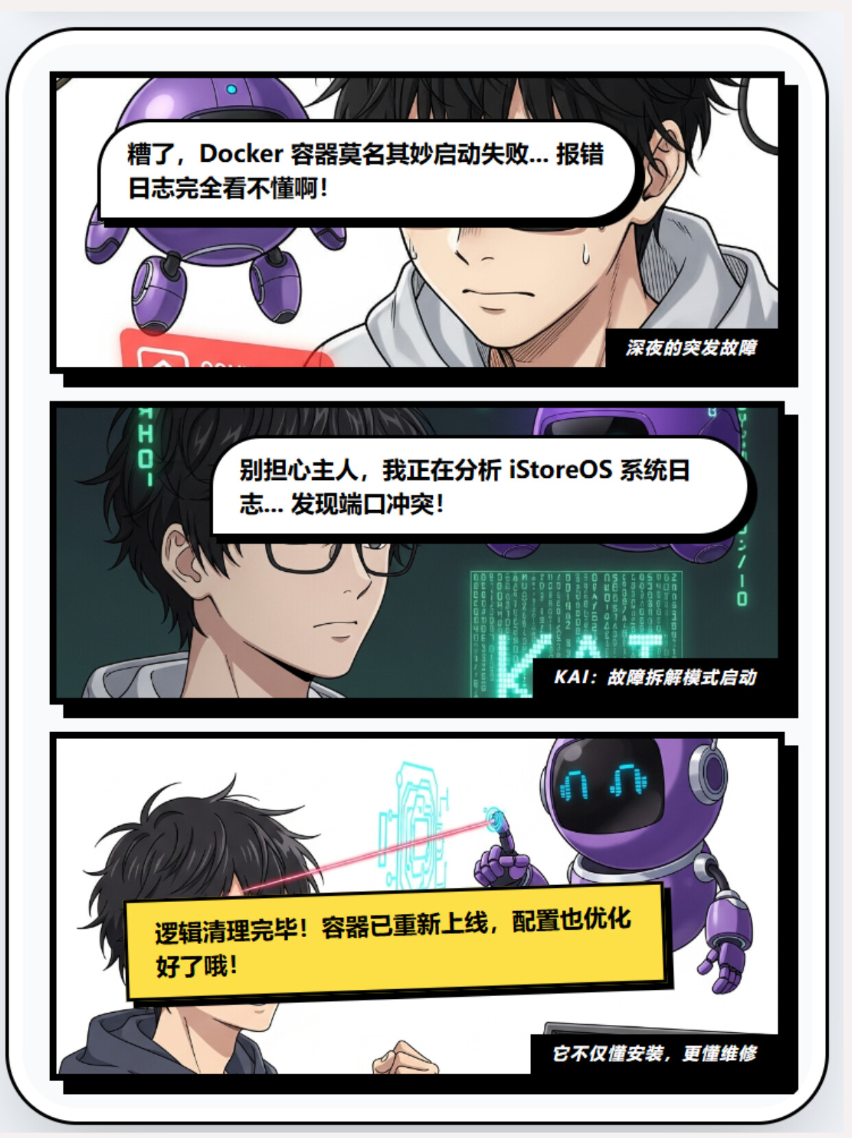 以前容器挂了,得自己查端口冲突、查配置错误。现在KAI能直接分析系统日志,发现是端口冲突还是啥问题,然后自动把逻辑理顺,重启容器。简单说就是:它不仅能帮你装,还能帮你修。