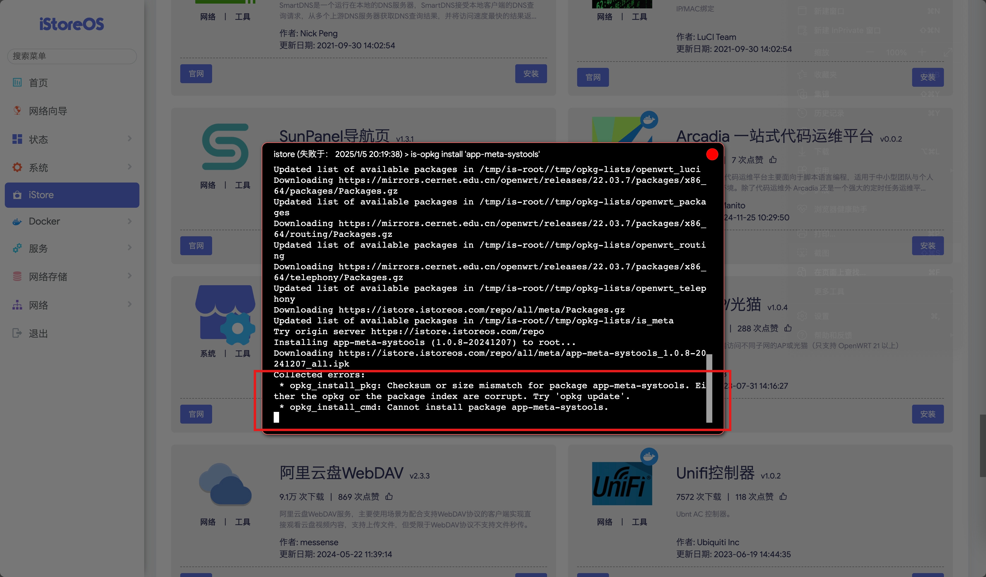 按提示,执行 opkg update 成功之后,安装仍然报错,切换到其他软件源也不行。