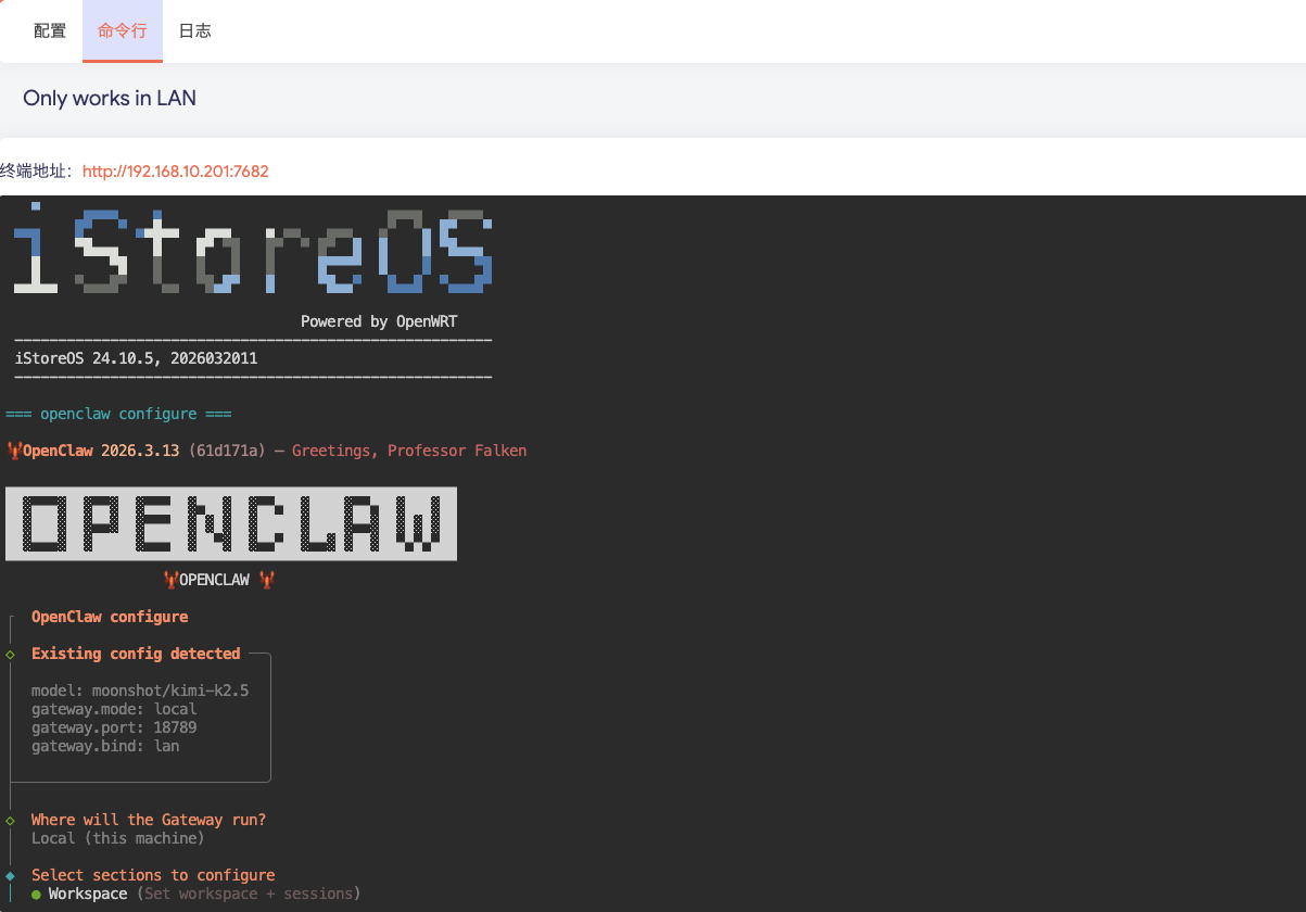Web终端 上周我们的iStoreOS里装了龙虾,很多朋友都使用了。