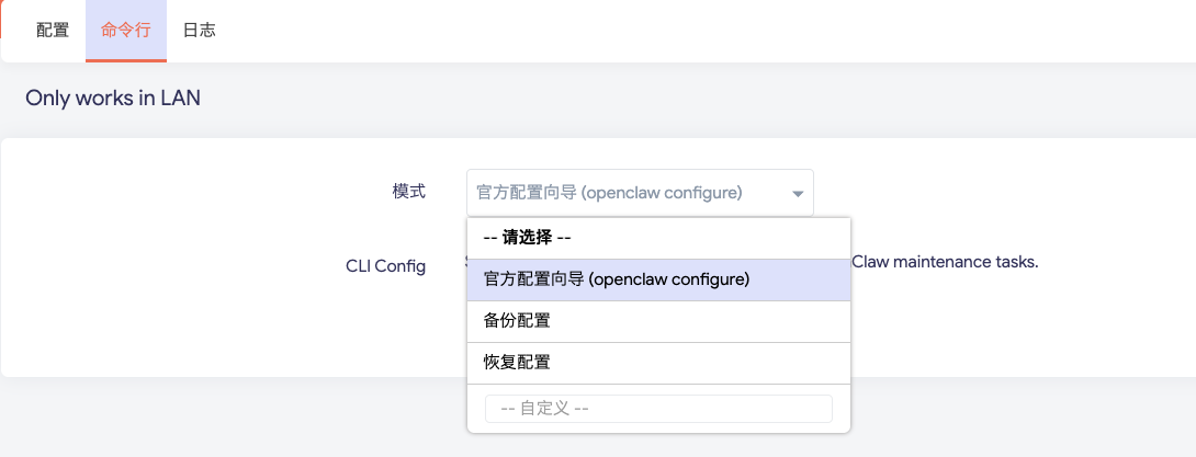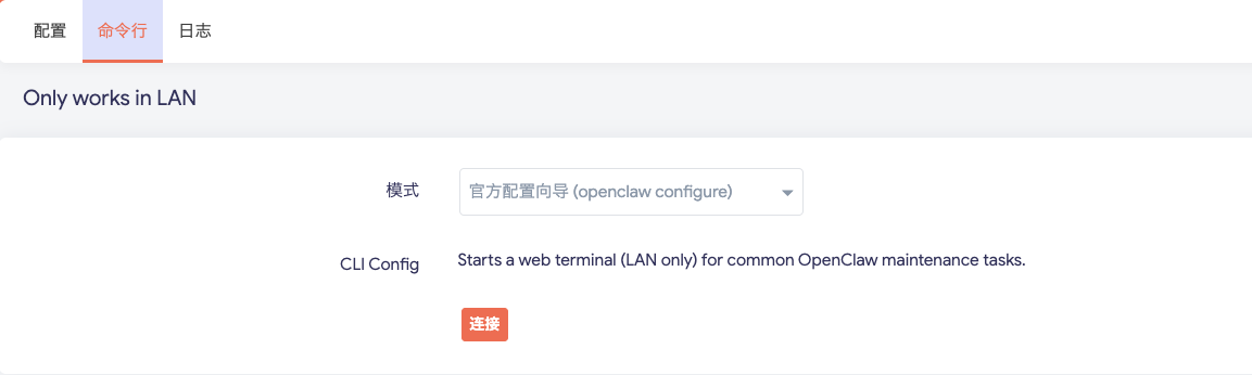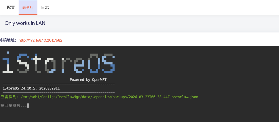 启动一个 Web 终端(仅限局域网),用于执行常见的 OpenClaw 维护任务。