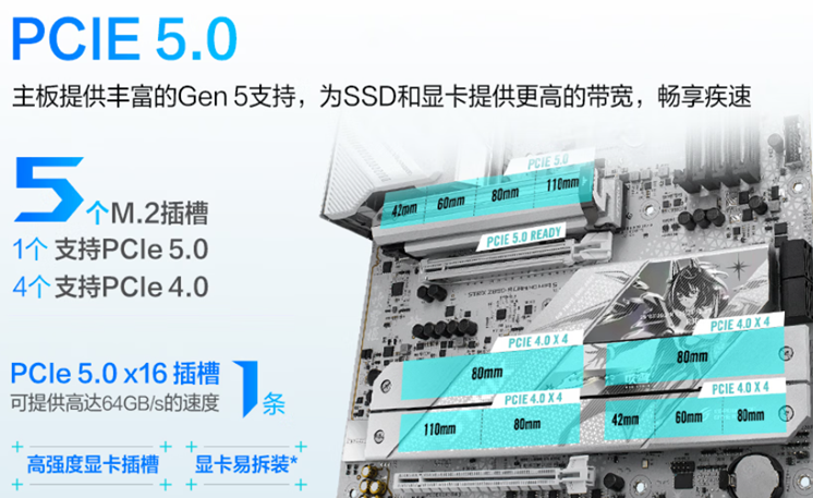 存储方面,主板共配备了5 个 M.2 接口,其中 1 个为 PCIe 5.0 x4 规格,4 个为 PCIe 4.0 x4 规格,完全满足玩家的高速固态扩容需求,无论是系统盘、游戏盘还是素材盘,都能找到对应的高速接口。