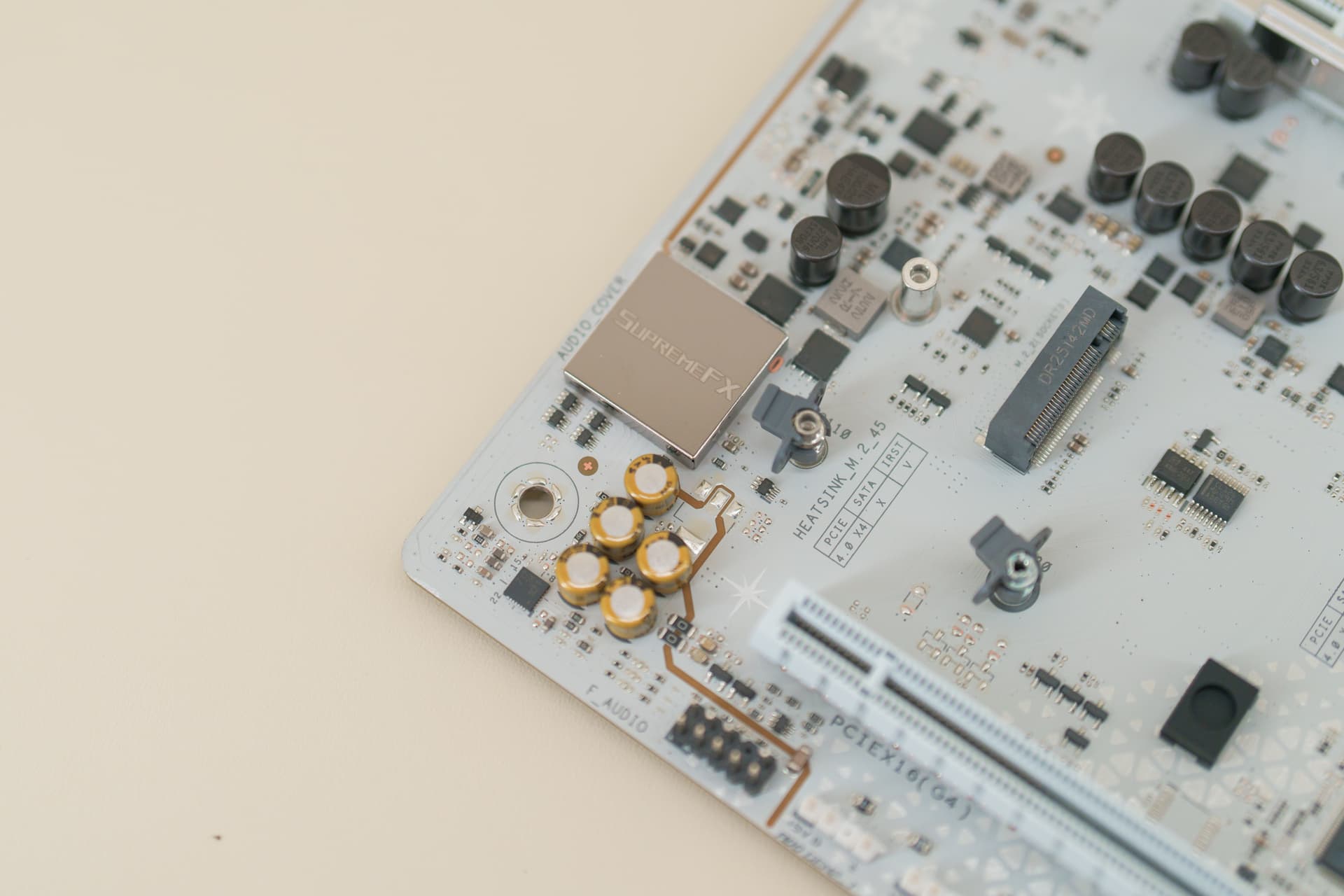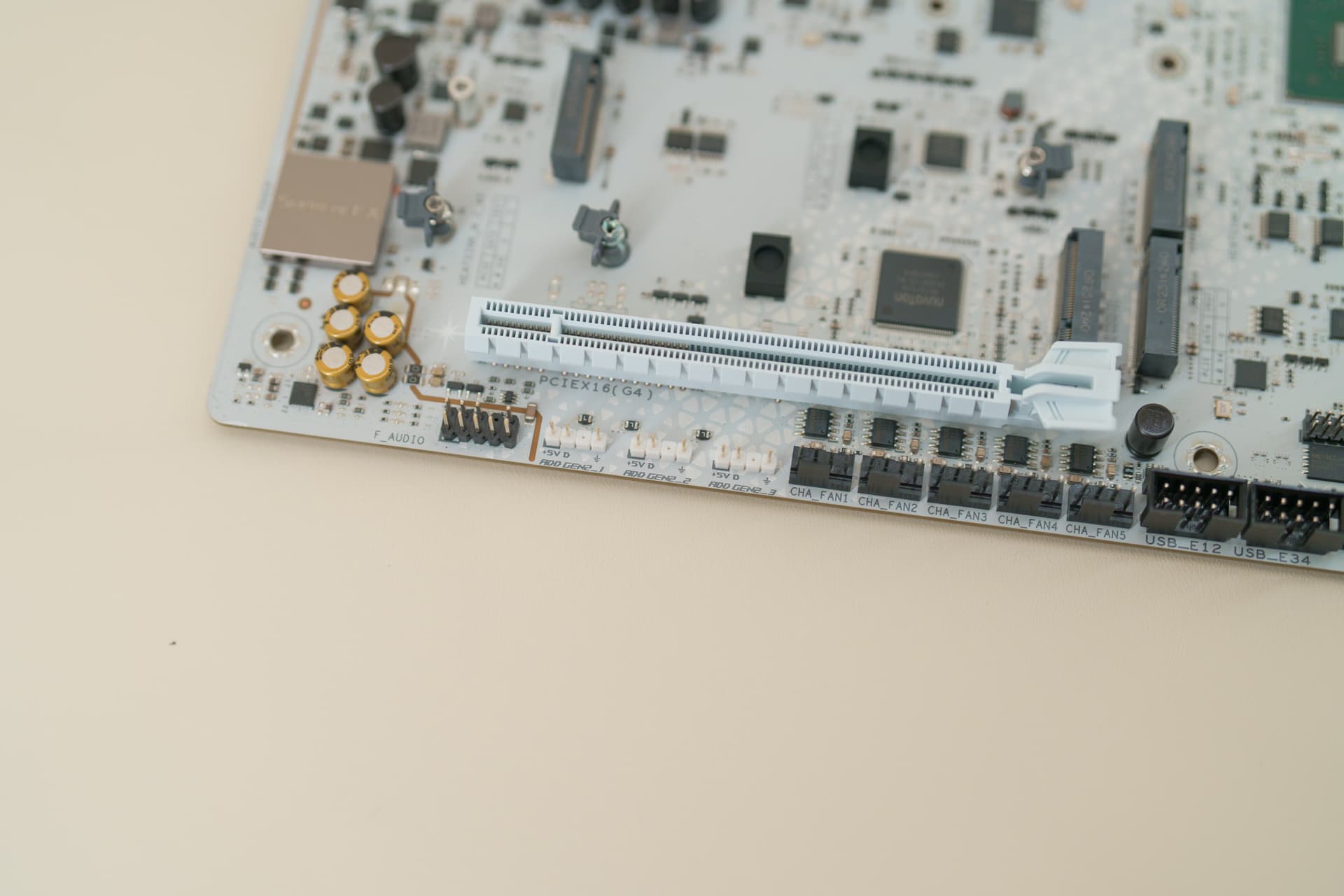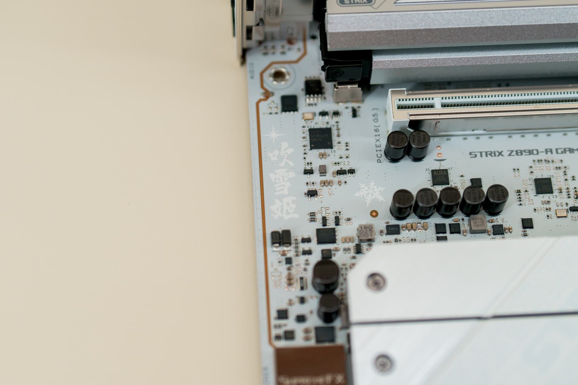 第一条PCIe显卡插槽附近,印有专属的“吹雪姬”印字,PCB 板上更是遍布着雪花纹理涂装,哪怕是不常被注意到的角落,也藏满了 IP 细节。