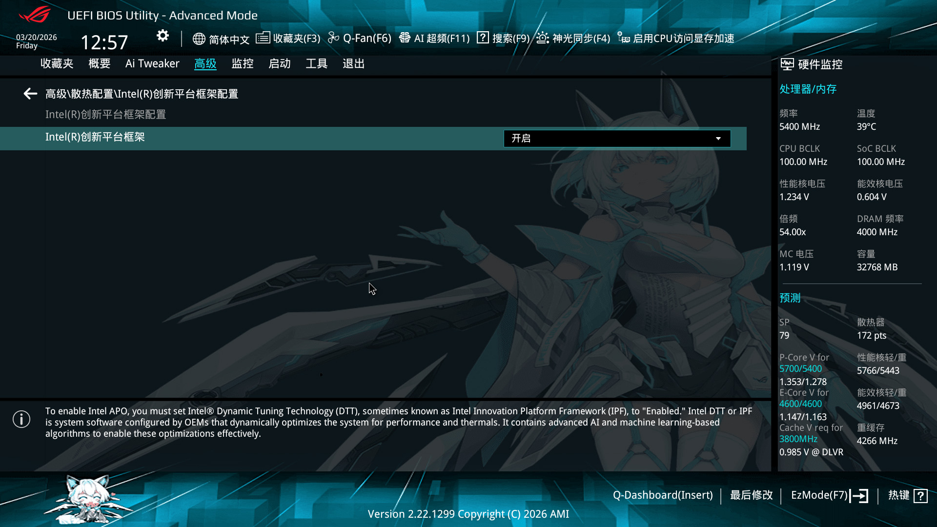 随着Ultra 200S Plus系列处理器的推出,Intel Binary Optimization Tool(简称 IBOT,英特尔二进制优化工具)也随之问世,而想使用这项功能,需要在主板中开启一项设置,那就是Intel Innovation Platform Framework(IPF),中文翻译叫做创新平台框架。不过我不太理解为什么华硕的BIOS中会把这个选项的上一级菜单命名为散热配置(Thermal Configuration),不过好在这个选项是默认开启的,正常情况下大家不需要特意来找。