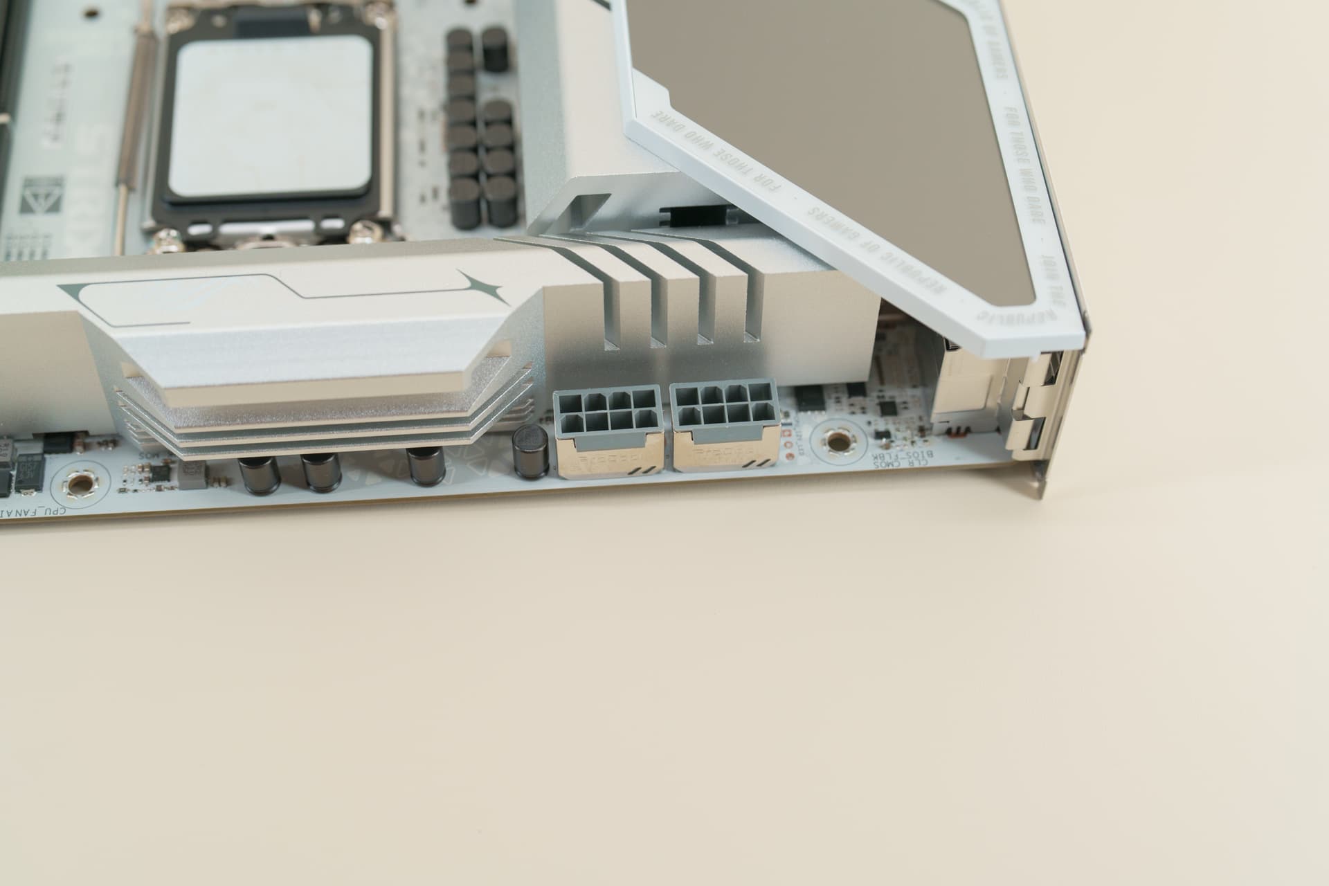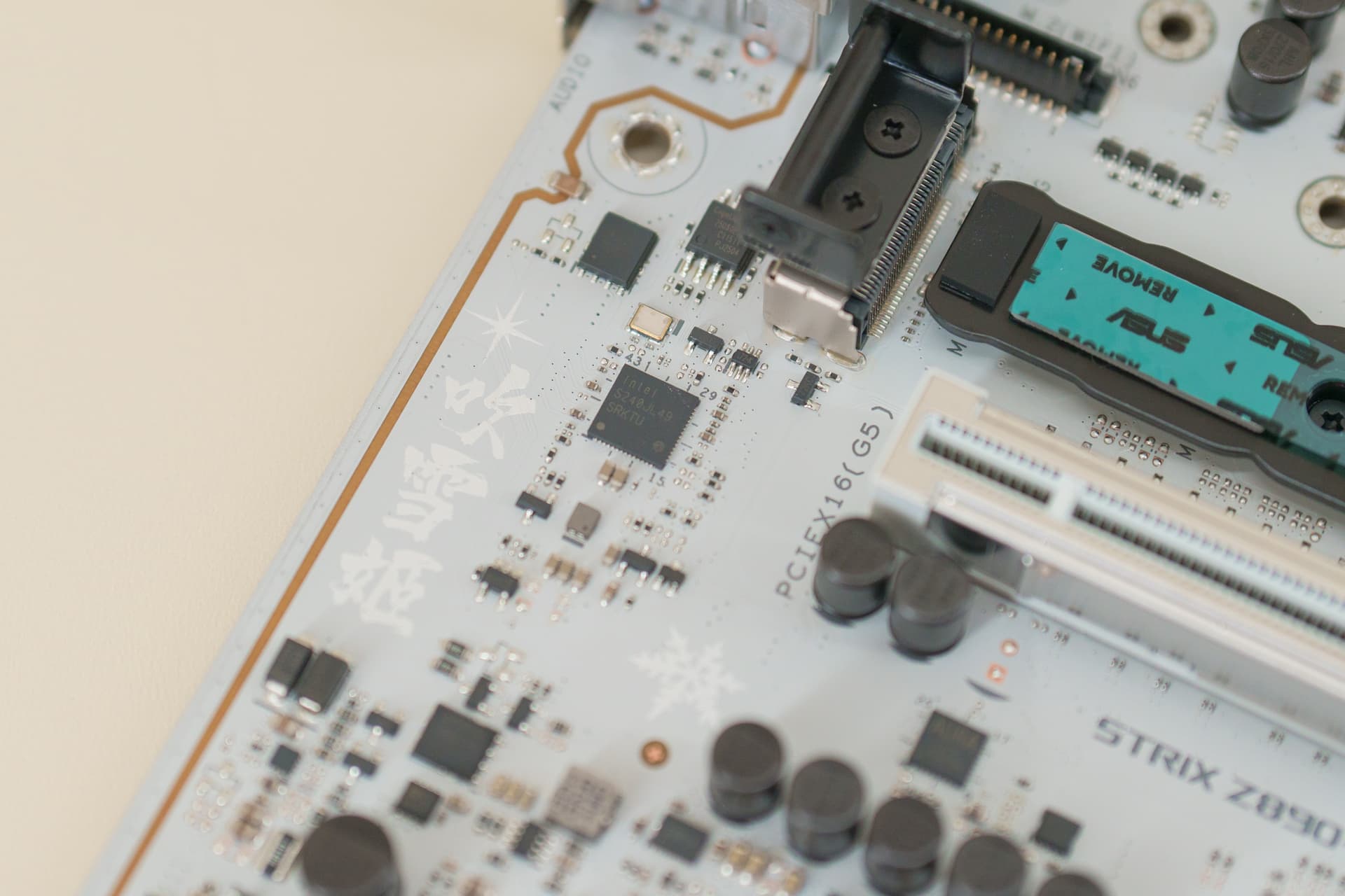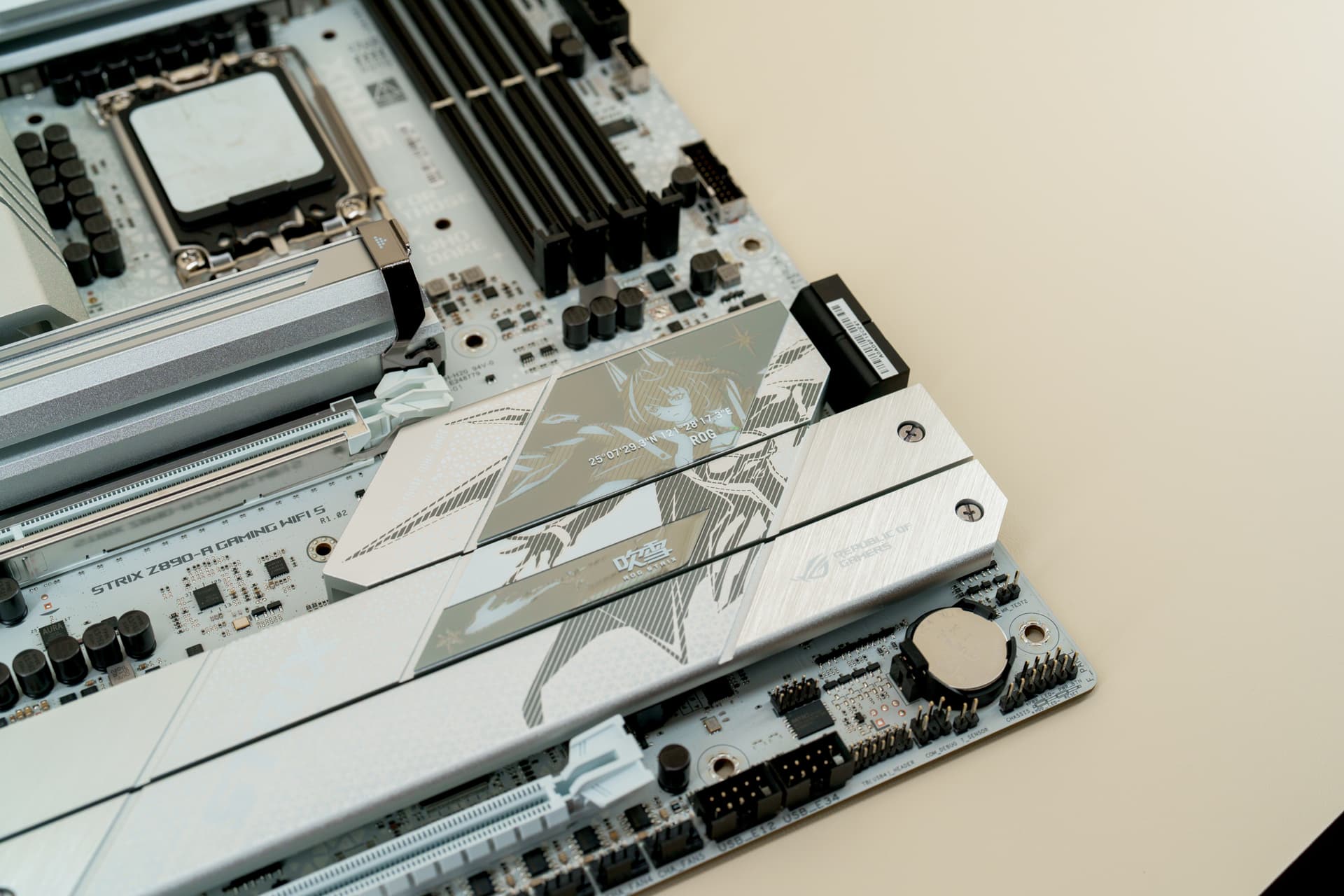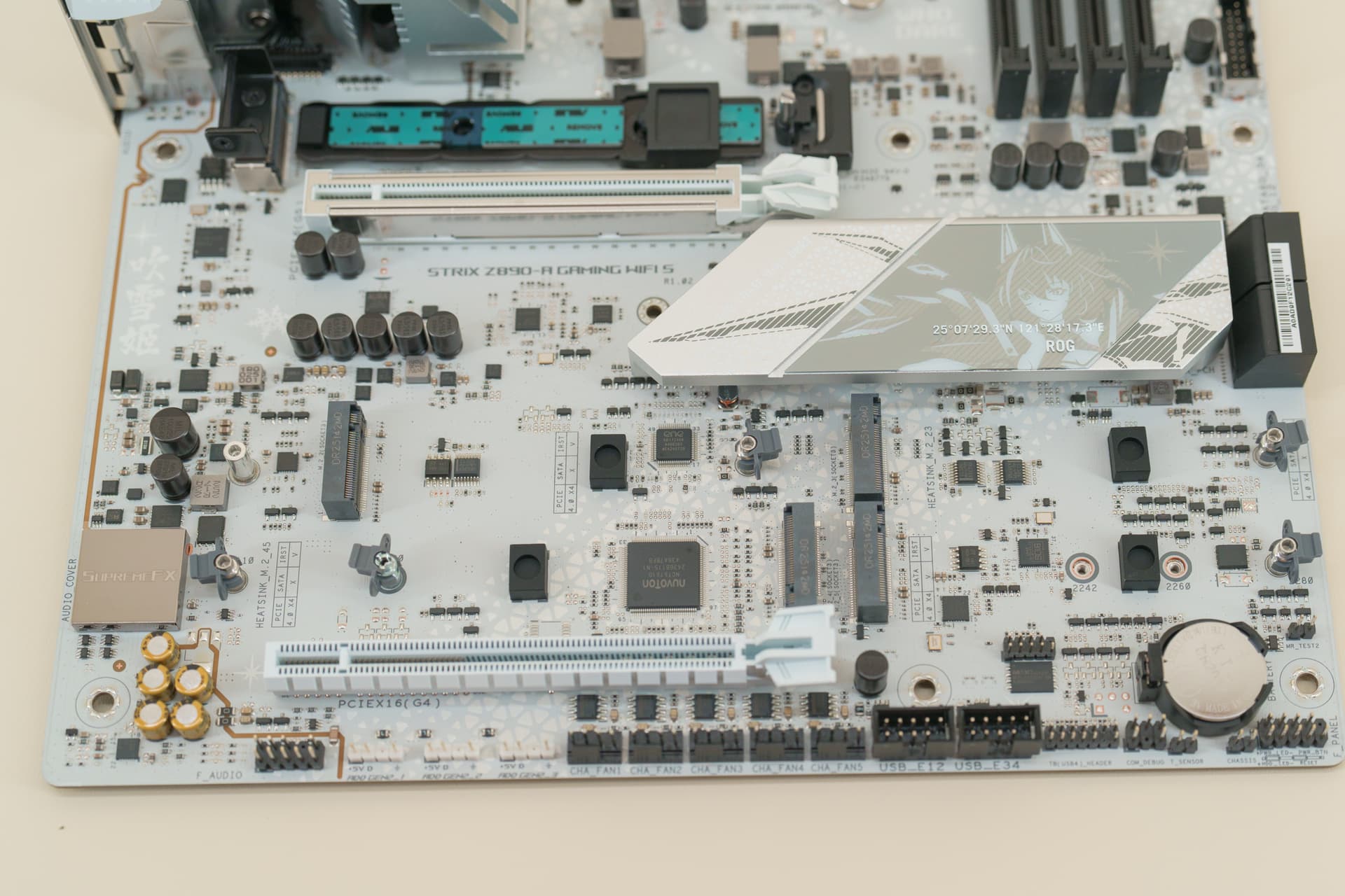 ROG Z890 吹雪S正面PCH+M.2散热装甲上的雪武战姬的立体浮雕设计非常精美,虽然视觉拉满,但却不得不面临一个现实问题,在巨型显卡大行其道的当下,这部分图案非常容易被显卡遮挡,表面看是有些可惜,但其实不做作的蕴含美才是真的美。
