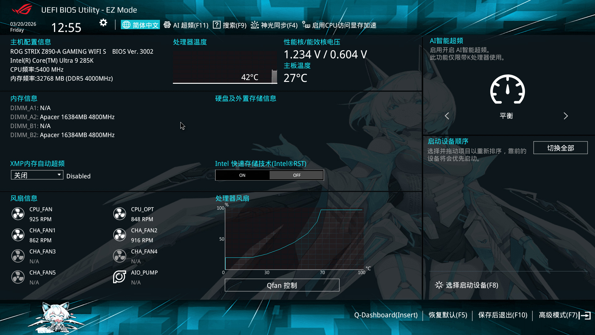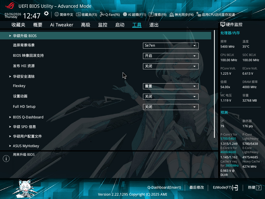 BIOS 方面,ROG Z890吹雪S搭载了1080P的专属 UEFI BIOS,全面适配吹雪主题,界面融入了雪武战姬视觉元素,颜值与功能性兼顾。便捷仪表盘 Q-Dashboard 与 Ez 模式,开机即可直观看到处理器、内存、温度、电压等核心硬件信息,常用的 XMP/AEMP 内存超频、启动项选择、风扇调速、灯光设置等功能,都能一键完成操作,无需深入复杂设置,就能轻松获得最优性能