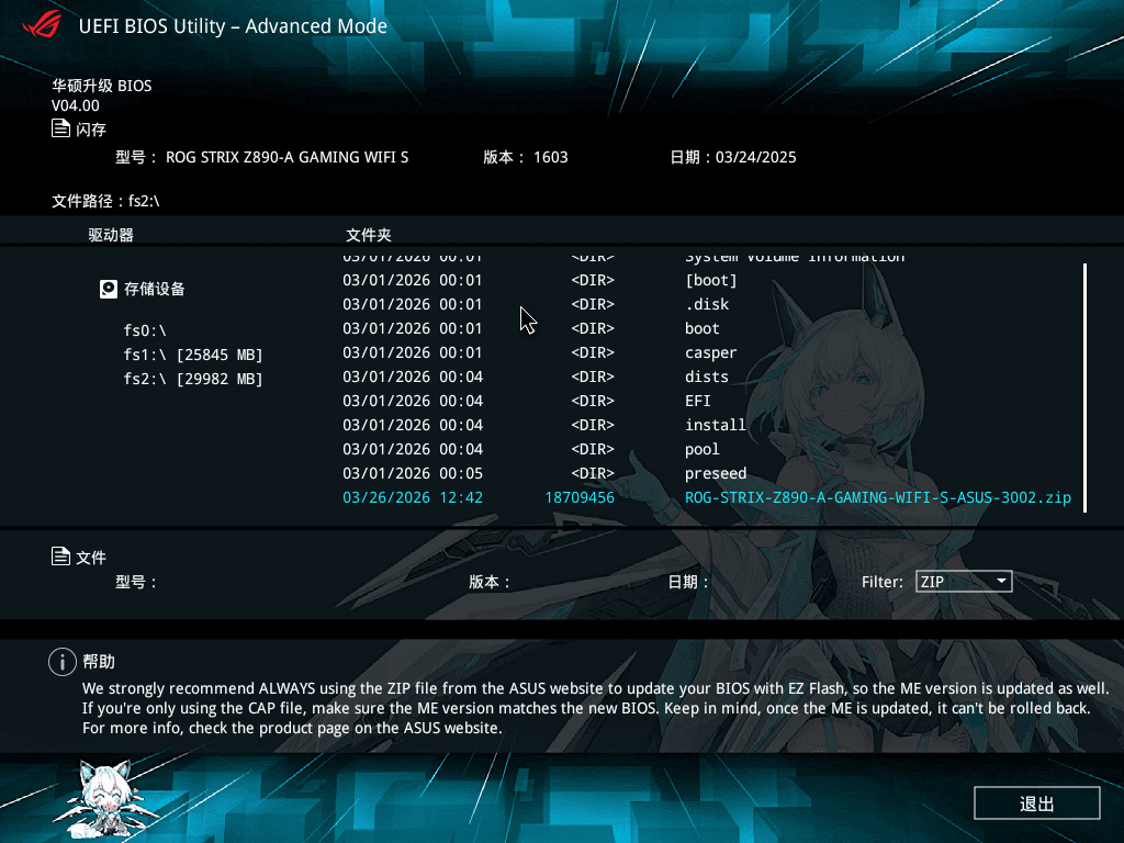 全图形化的便捷操作,支持鼠标点击,只需要将官网下载BIOS文件放在U盘里即可,升级过程十分简单。即使手中没有前代的Arrow Lake处理器来点亮主板也完全不用担心,直接使用BIOS FLASHBACK功能即可盲刷更新。