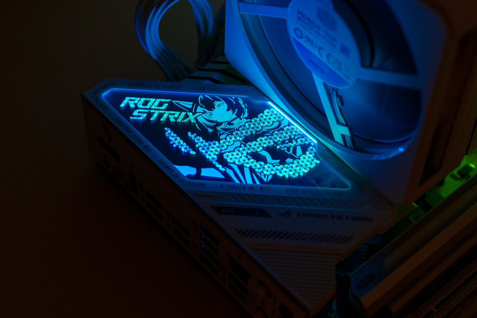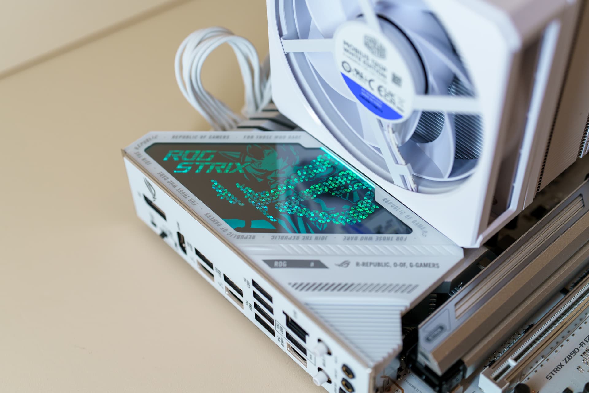 点亮主机后,I/O 装甲处的 AURA SYNC 灯效亮起,我们便可以尽情吹雪姬的盛世美颜了,当然也会支持AURA SYNC神光同步。