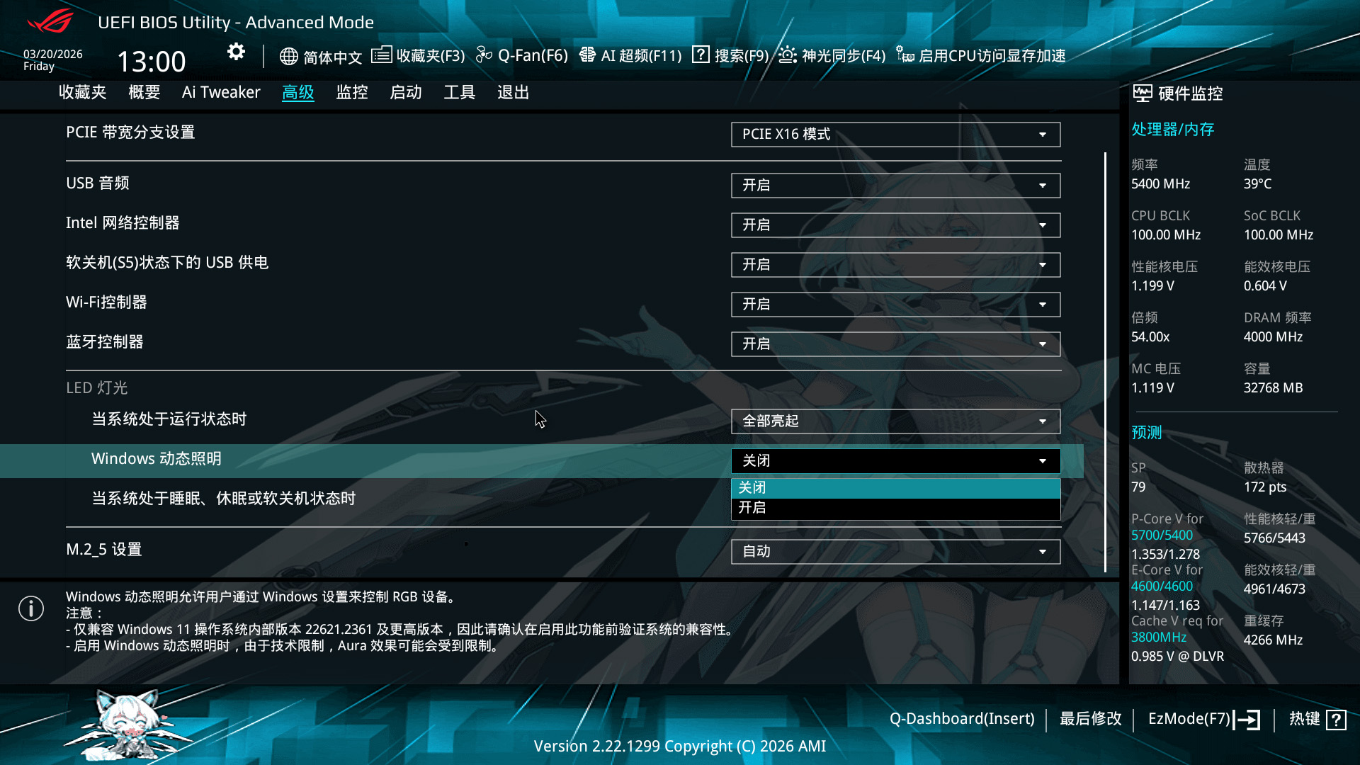 虽然华硕奥创软件已经演进很多年了,功能越来越强大,占用系统资源也逐渐减少,但是还是有些玩家对纯净系统有着别样执着,华硕当然也没有忘记这部分玩家,在BIOS中开启Windows动态照明,即可让Windows 11原生的灯光控制程序接管整个Aura Sync灯光系统,不用再安装任何其他软件。不过Windows原生控制程序的功能较少,支持的效果远不如奥创,对于想要更多个性化效果的玩家,还是推荐使用奥创工具。