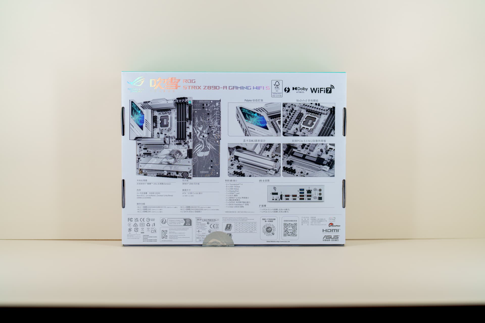 ROG Z890 吹雪S盒身侧面与背面则清晰标注了产品的核心特性 ——16+1+2+2 相超强供电、WiFi7 无线连接、PCIe 5.0 扩展、AI 智能优化四大核心技术,以及 DDR5 9066+MT/s 内存支持、双雷电 4 接口等关键规格,开箱前就能对产品实力一目了然。