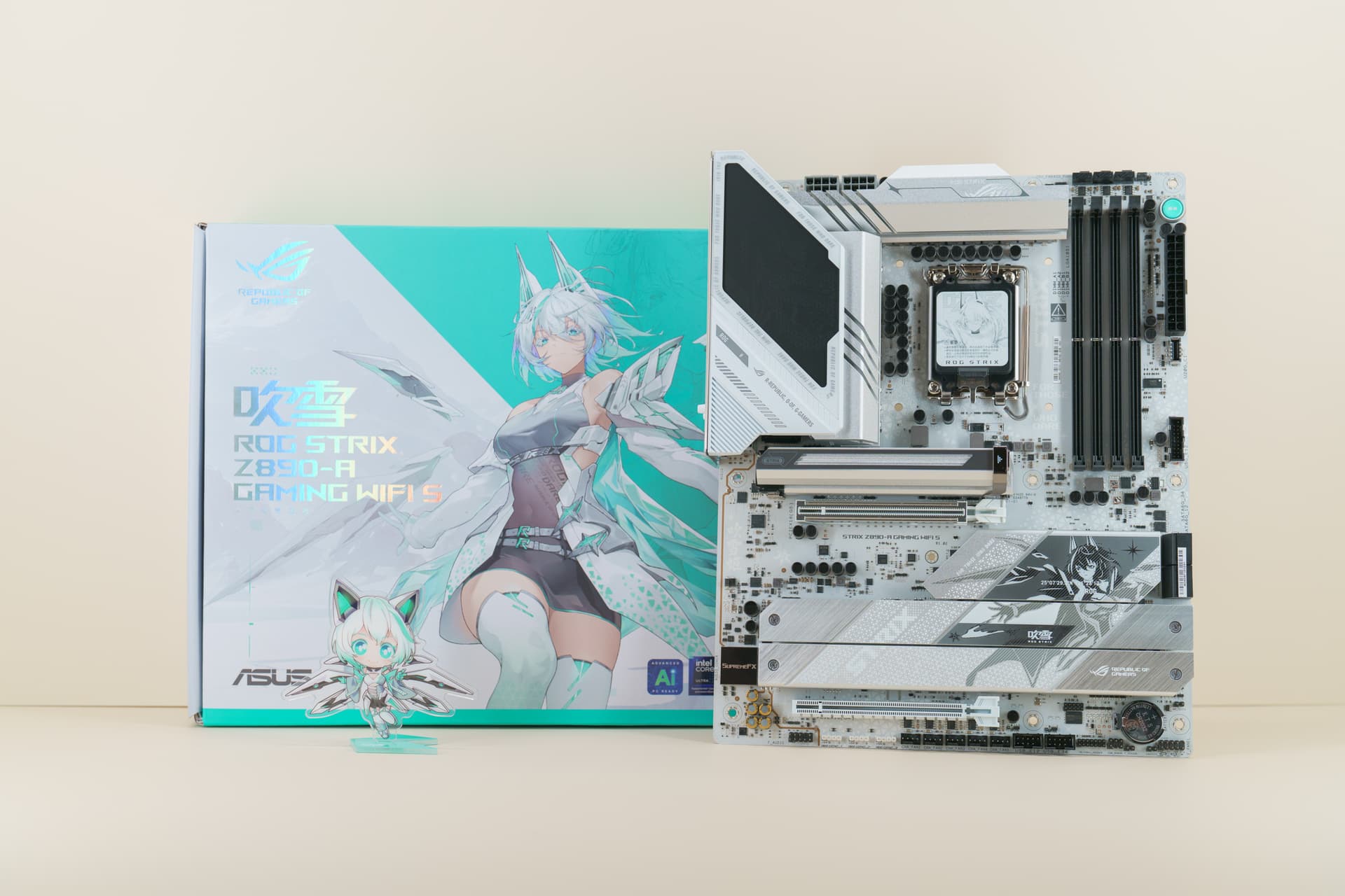 外包装方面,ROG Z890 吹雪S传承了标志性的青白主视觉设计,盒身正面印有极具辨识度的雪武战姬立绘,搭配醒目的 ROG STRIX LOGO 与产品型号,一眼就能认出其吹雪家族身份。