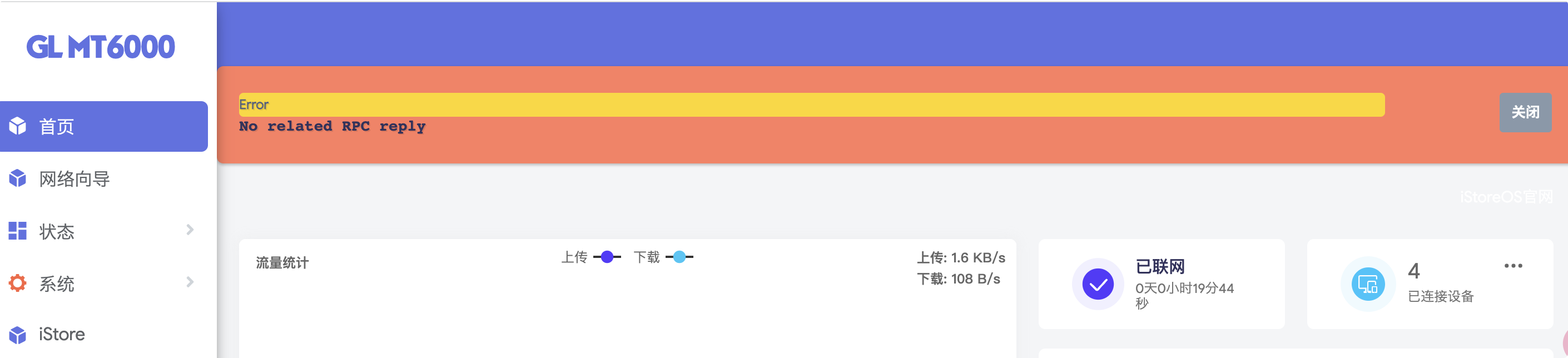A:mt6000由于4.7版本更新了,在安装istoreos商店之后,首页出现这个错误:“Error No related RPC reply”