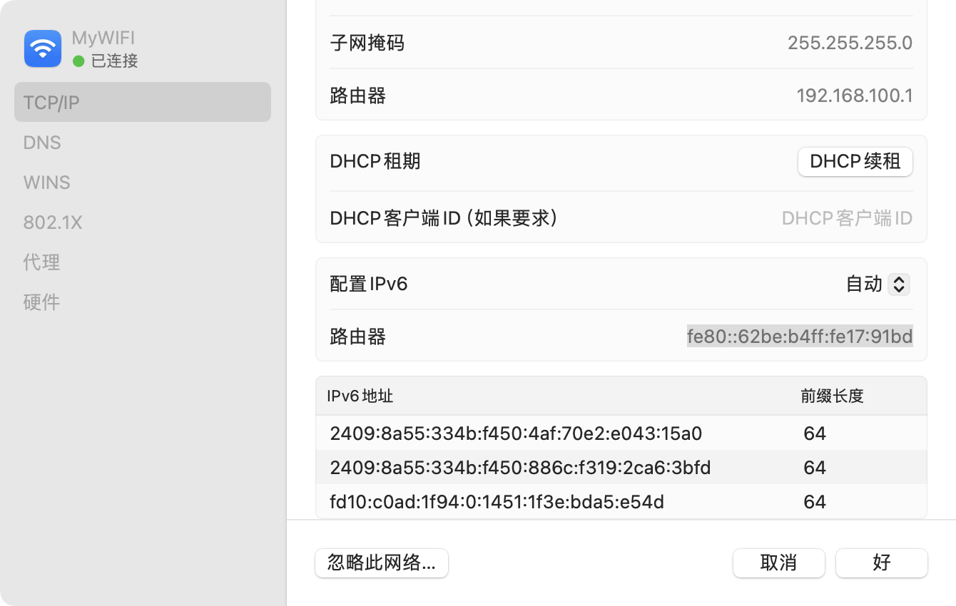 通过设置,也成功让macbook能够分配到了ipv6: