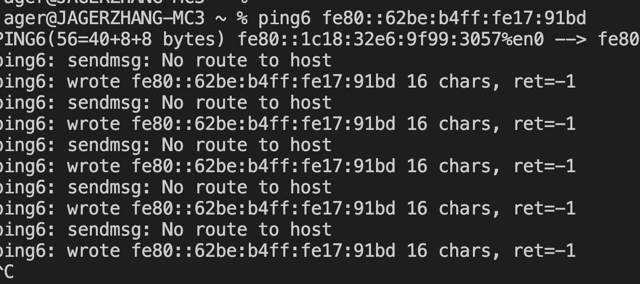 于是我试了下,从macbook ping6 网关也提示没有路由