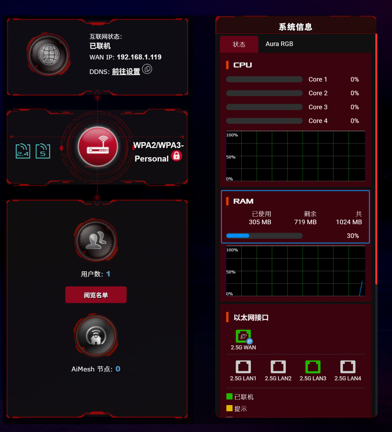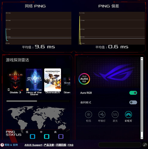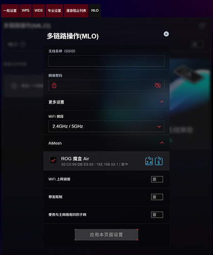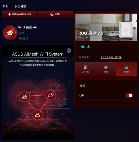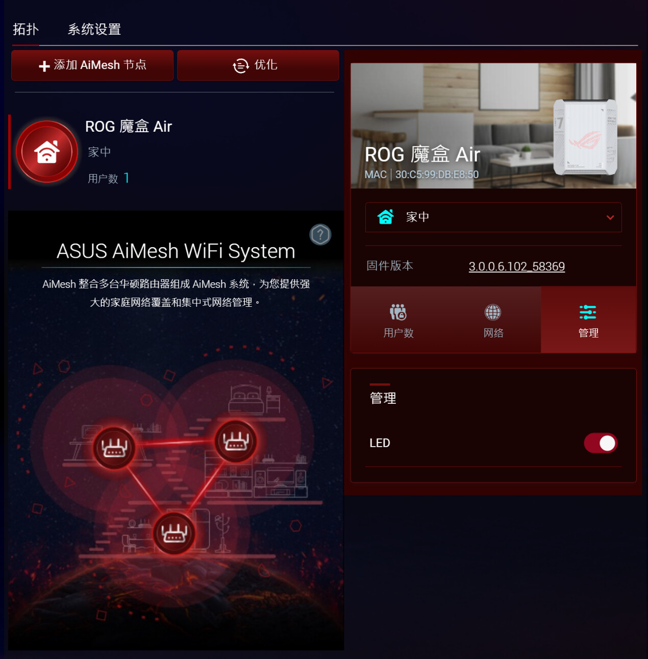 ▲支持Ai Mesh 2.0随心组网技术,可与兼容的华硕路由器构建无缝漫游网络。 管理界面提供LED总控开关,可以关闭ROG信仰灯效,打造纯粹无光污染的竞技环境。