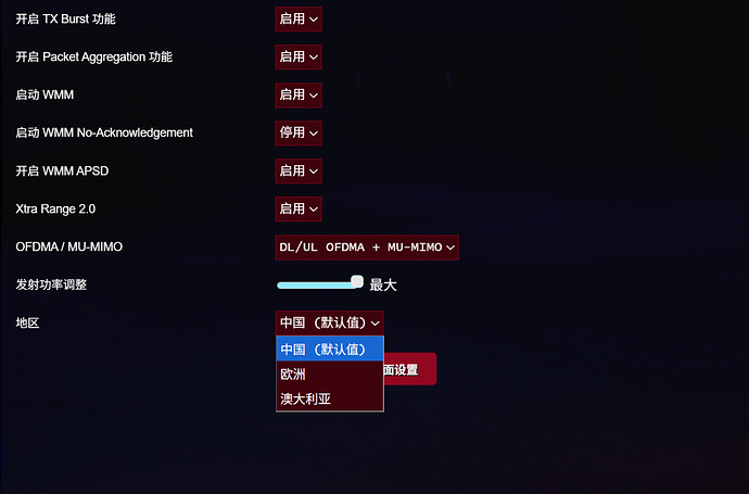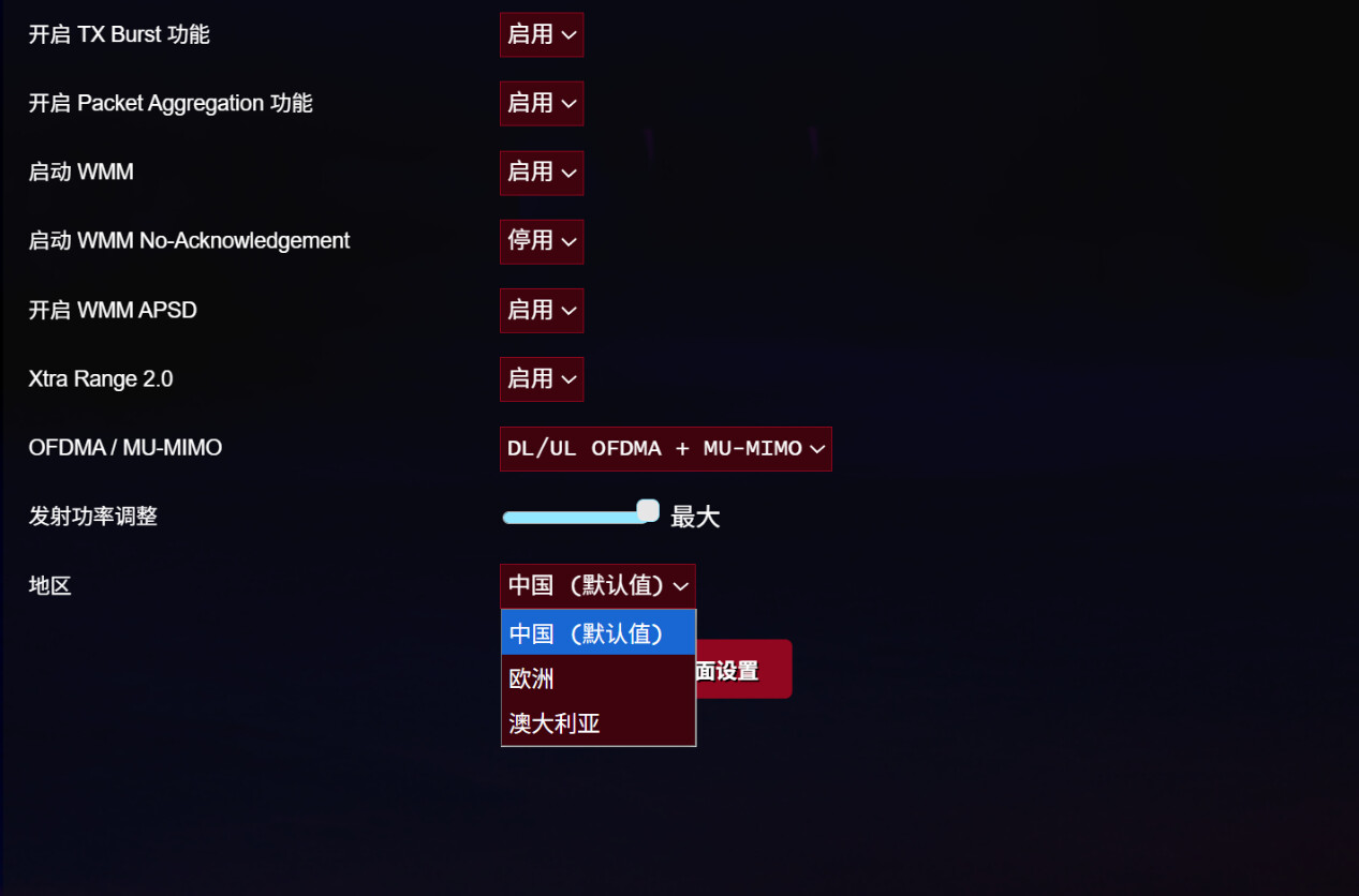 地区: 不同地区对无线设备的发射功率、工作信道等有监管、法规相关要求。 当前选择为中国,默认值。 下方还有一个选项是“澳大利亚”,提示用户可以通过切换无线地区来增强无线发射功率,澳大利亚的无线发射功率最强。