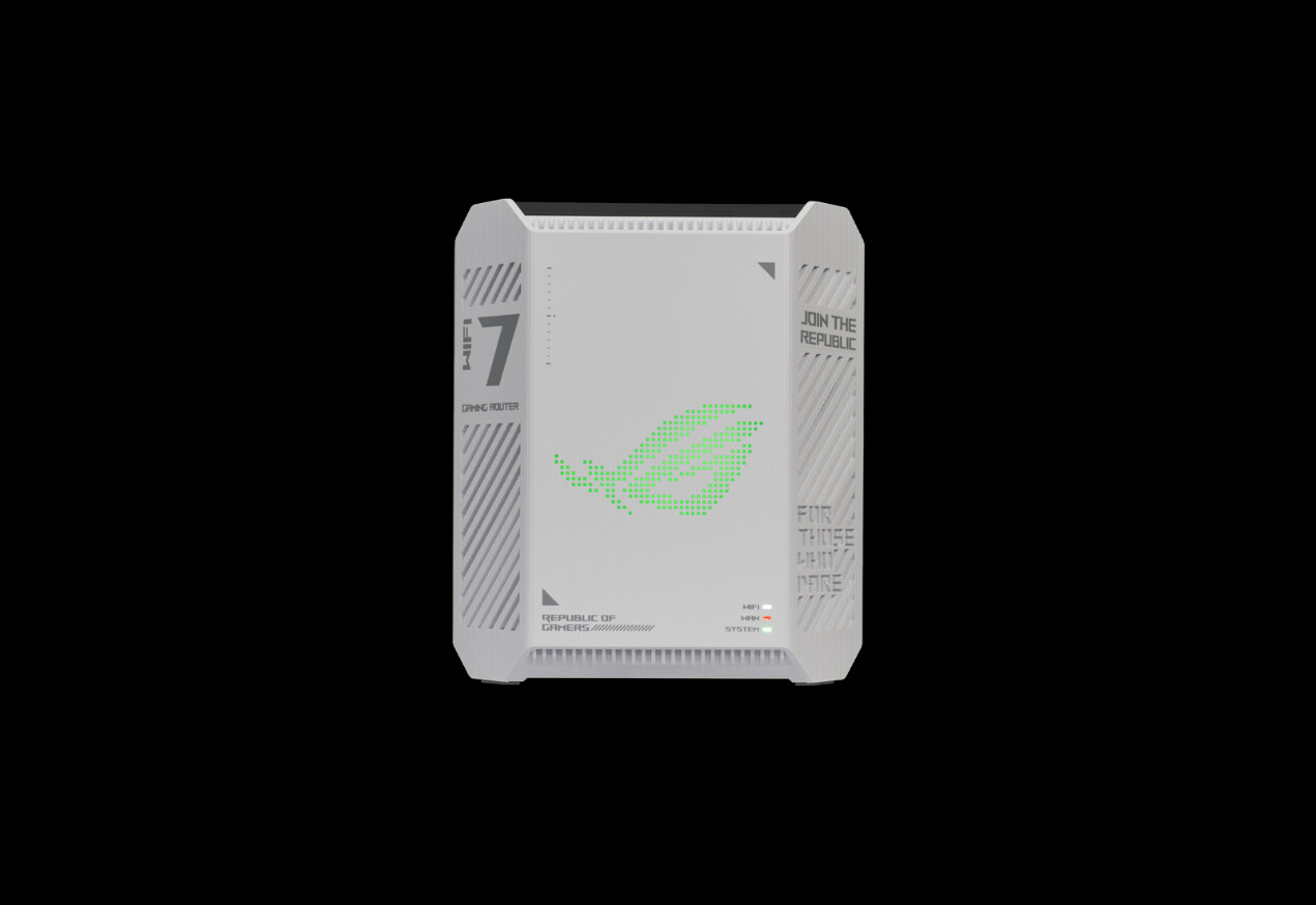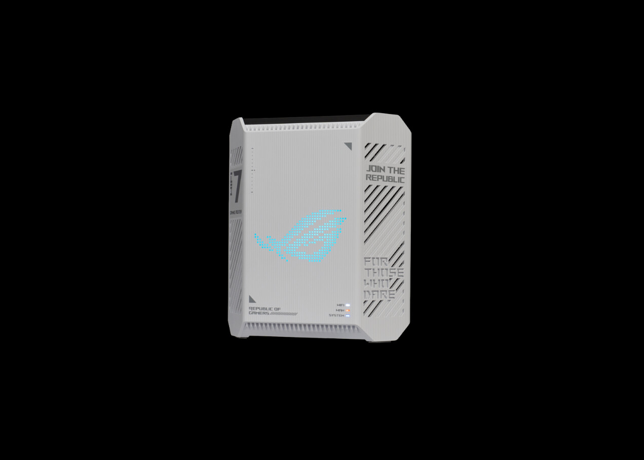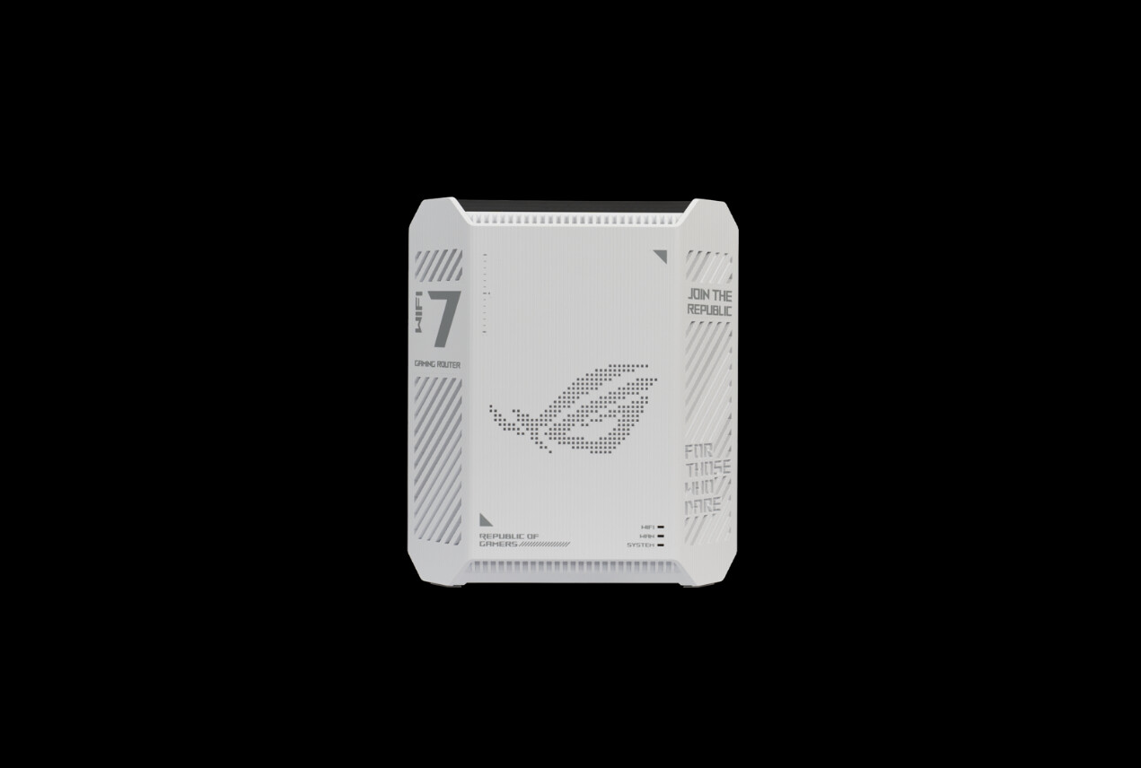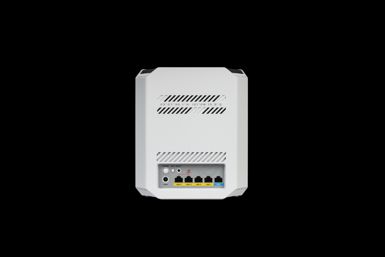 ▲路由器本体采用月耀白配色,正面以点阵式工艺打造 ROG 标志性败家之眼 LOGO,搭配 Wi Fi 7 标识与品牌标语,延续家族式电竞美学设计,兼具科技感与辨识度。