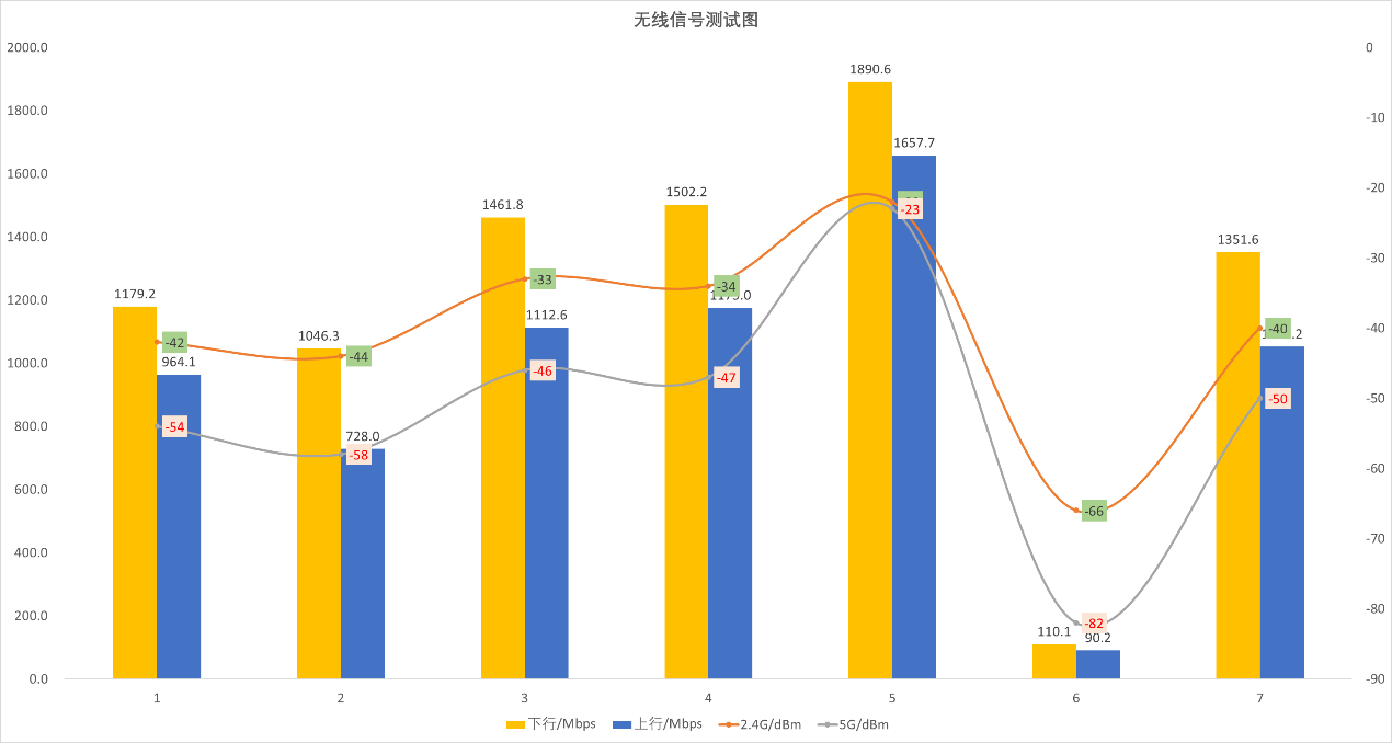 ▲华硕ROG魔盒AIR在信号测试中表现出色,尤其在1号到5号位置的信号强度和网络速度方面表现优异。 6号位置由于承重墙和障碍物较多的原因,导至5G覆盖信号较弱,可以考虑在位置6附近增加Ai Mesh节点,以改善最弱信号区域。 ROG魔盒AIR整体信号表现优秀,尤其在近场区域能提供极快的网络速度。