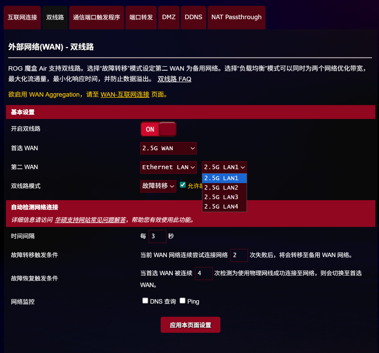 ▲开启双线路后,可以将任意的LAN口配置为第二个WAN口,使用故障转移或者负载均衡模式。