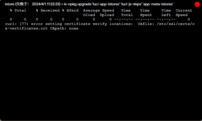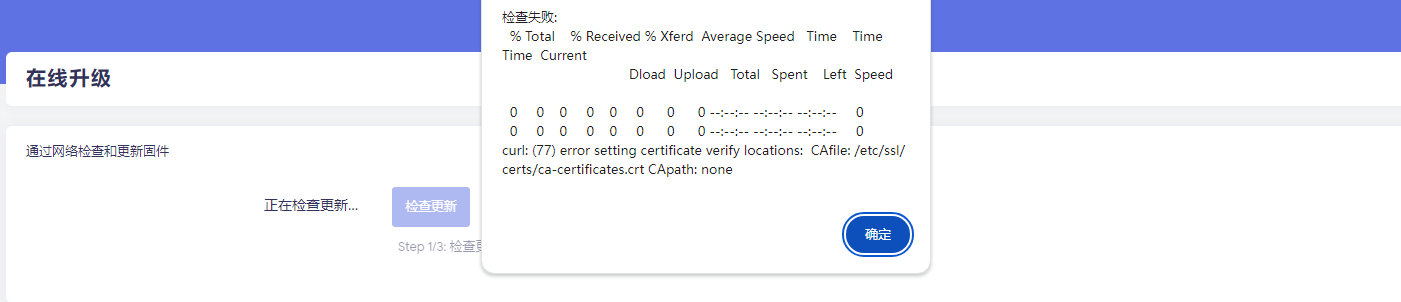 在iStore里更新或者下载和以及拉取任何Docker新插件均提示,无法认证SSL,在系统更新界面更新固件也有这个提示。固件是可以正常上网状态也是能够正常使用。安装失败如图所示。
