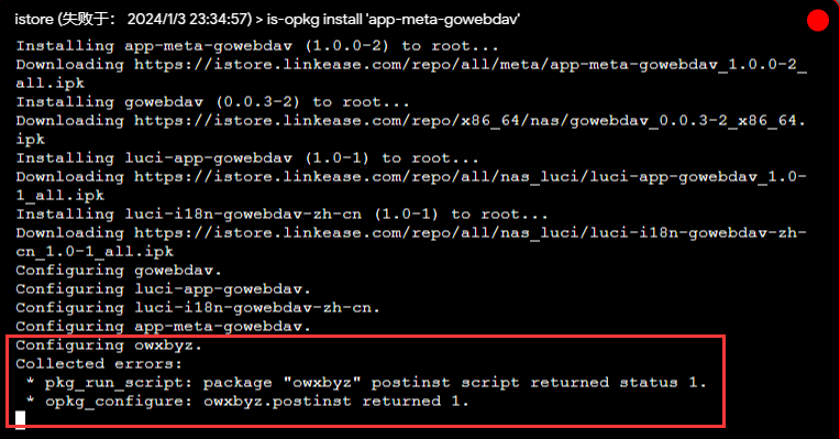 * pkg_run_script: package "owxbyz" postinst script returned status 1.