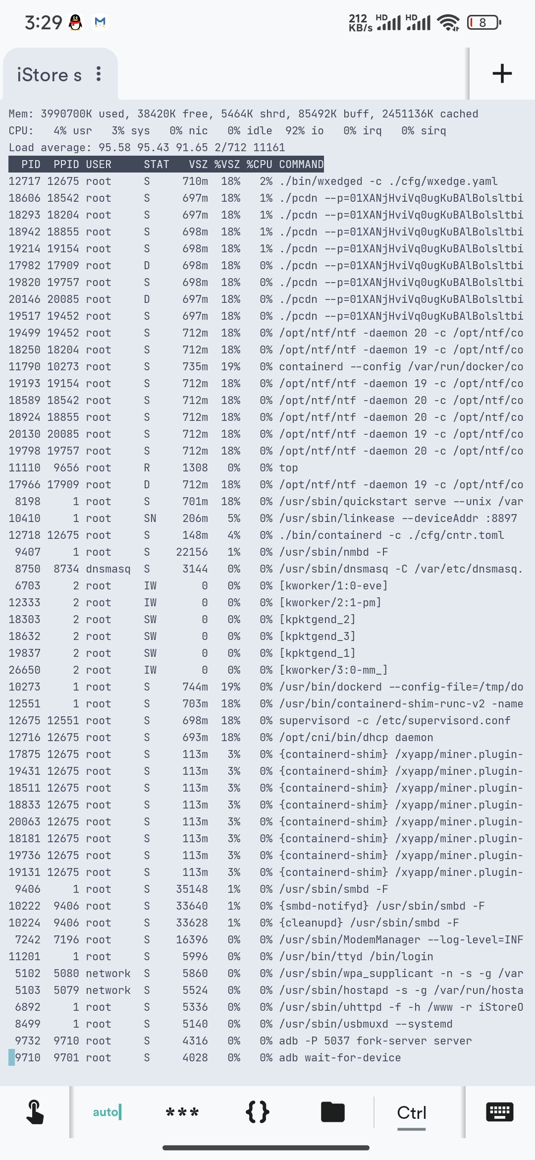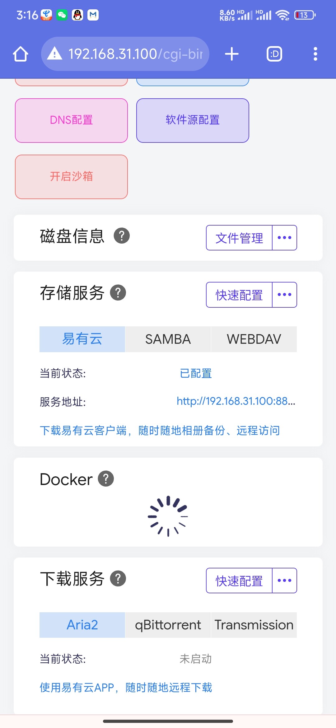 这边磁盘是不显示了,下边docker也是转圈圈,关闭网心的容器,后还是一样,点击重启,之后无法进入web,断电重启就行。