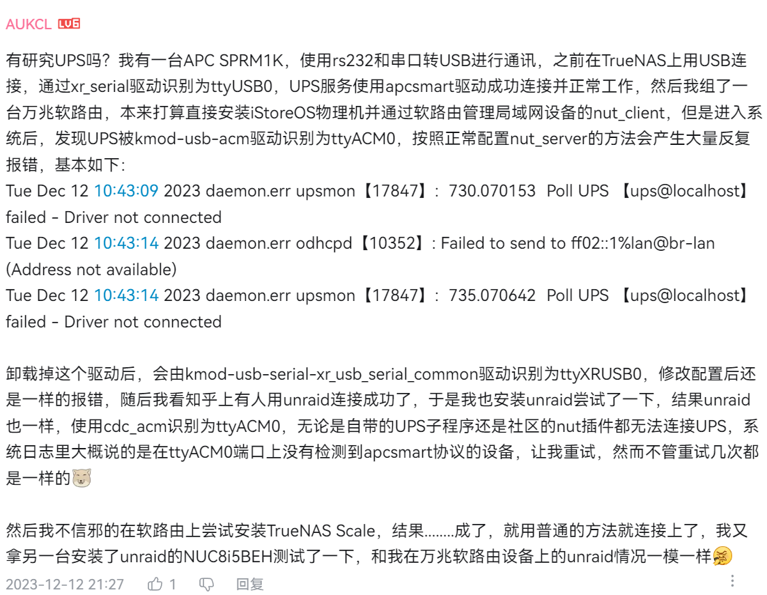 有研究UPS吗?我有一台APC SPRM1K,使用rs232和串口转USB进行通讯,之前在TrueNAS上用USB连接,通过xr_serial驱动识别为ttyUSB0,UPS服务使用apcsmart驱动成功连接并正常工作,然后我组了一台万兆软路由,本来打算直接安装iStoreOS物理机并通过软路由管理局域网设备的nut_client,但是进入系统后,发现UPS被kmod-usb-acm驱动识别为ttyACM0,按照正常配置nut_server的方法会产生大量反复报错,基本如下: