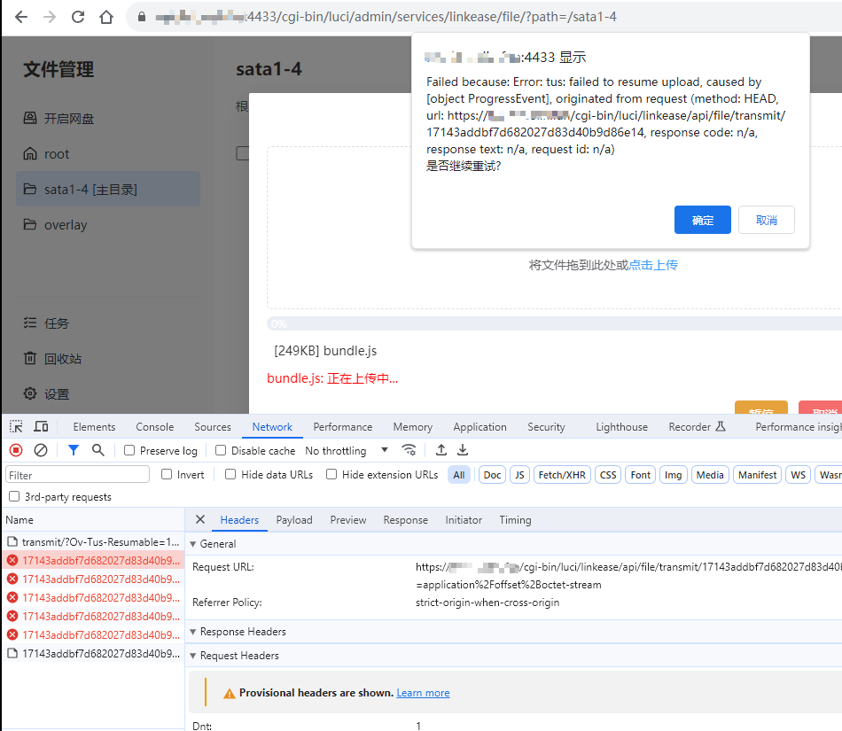 第二个接口 cgi-bin/luci/linkease/api/file/transmit/ 没有拼接 4433端口,跨域报错。