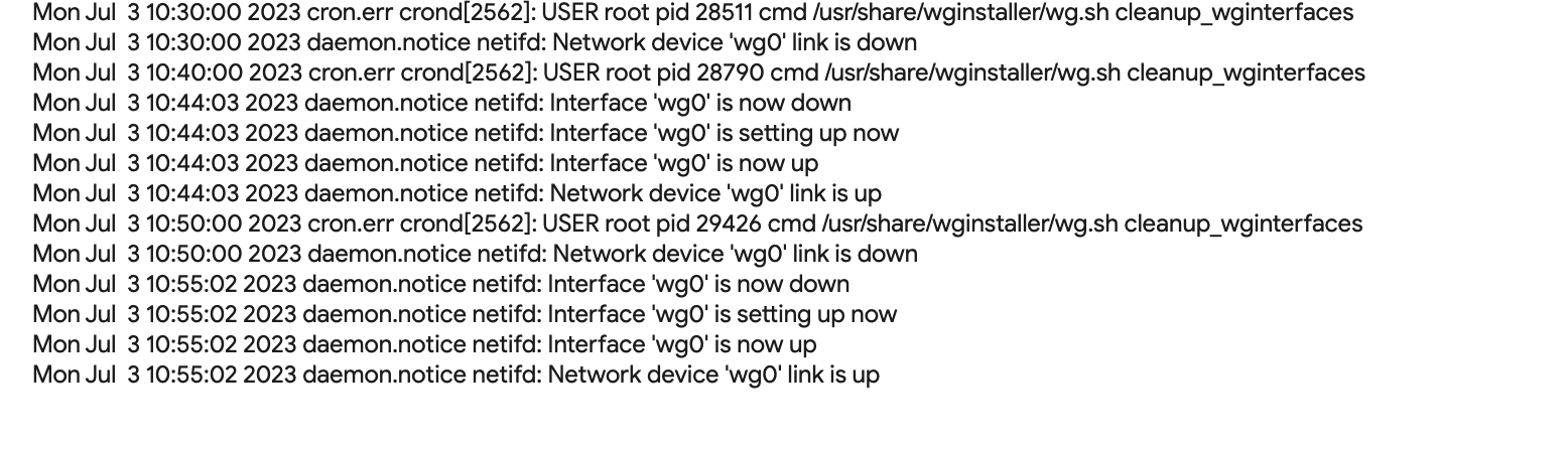 Mon Jul 3 00:50:00 2023 daemon.notice netifd: Network device 'wg0' link is down