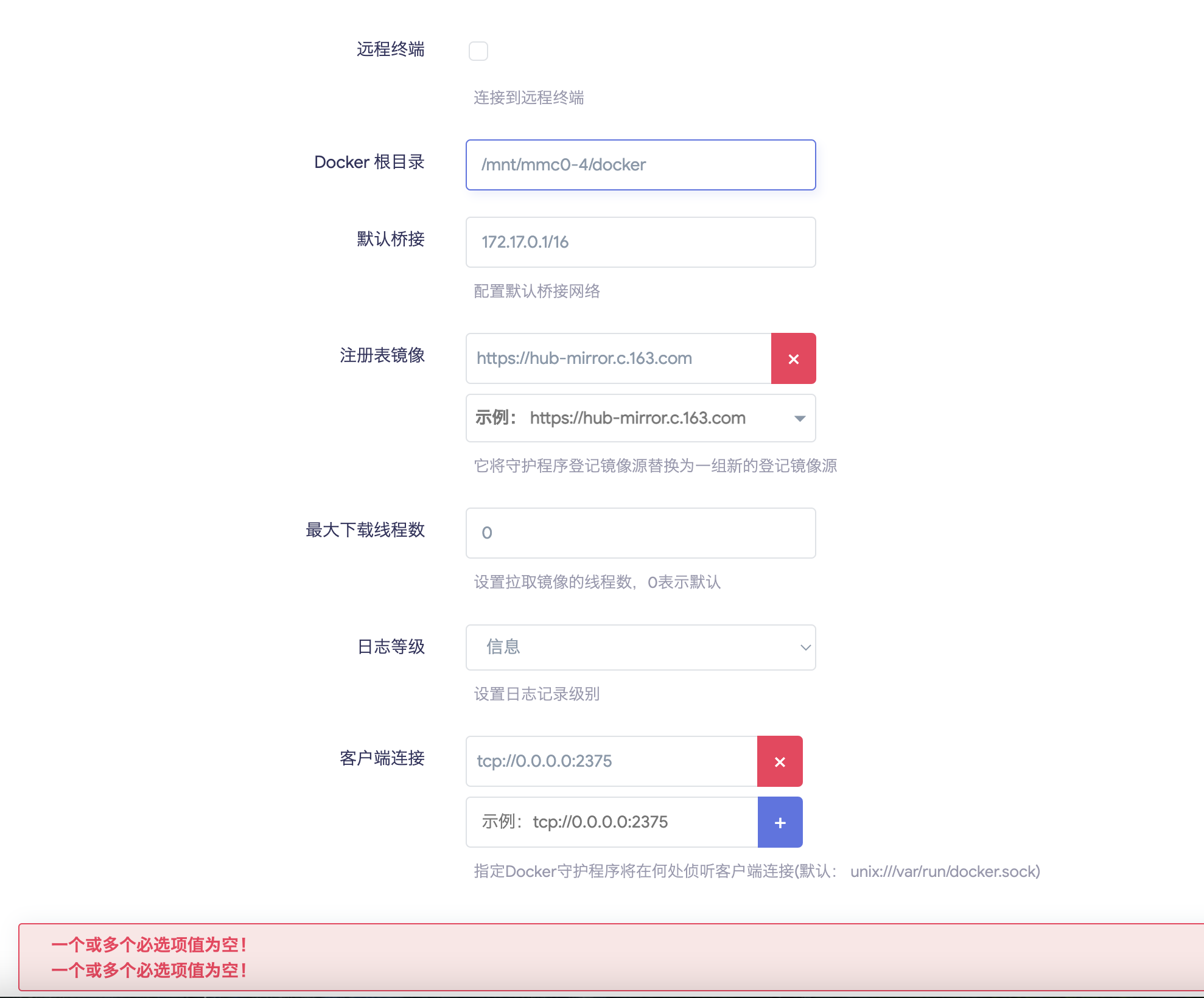 A:docker配置了远程终端,在关掉远程终端后,无法保存,显示:一个或多个必选项值为空!
