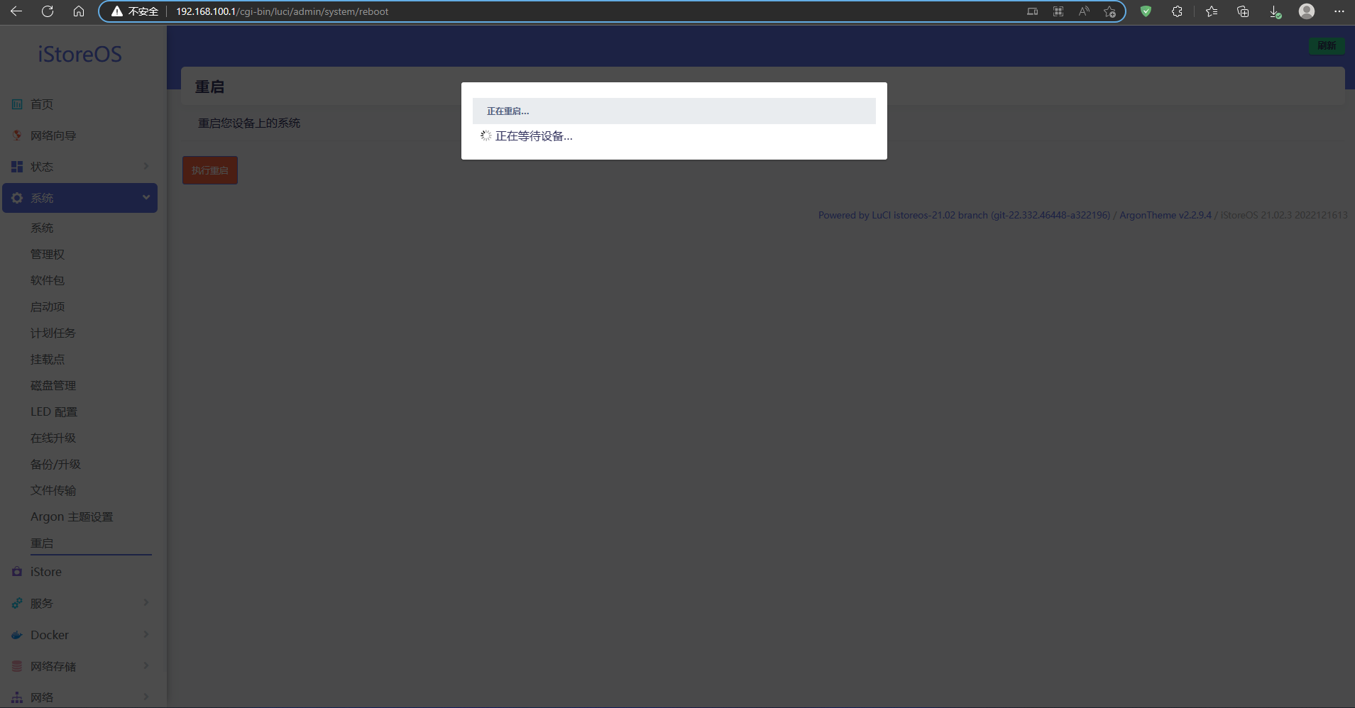 A:r66s烧录istoreos固件后,开机进入192.168.100.1,进入系统->重启页面直接重启,以太网断开连接后一直无法恢复,需要通过拔插电源来重启。尝试过r66s的出厂固件,并没有该现象。