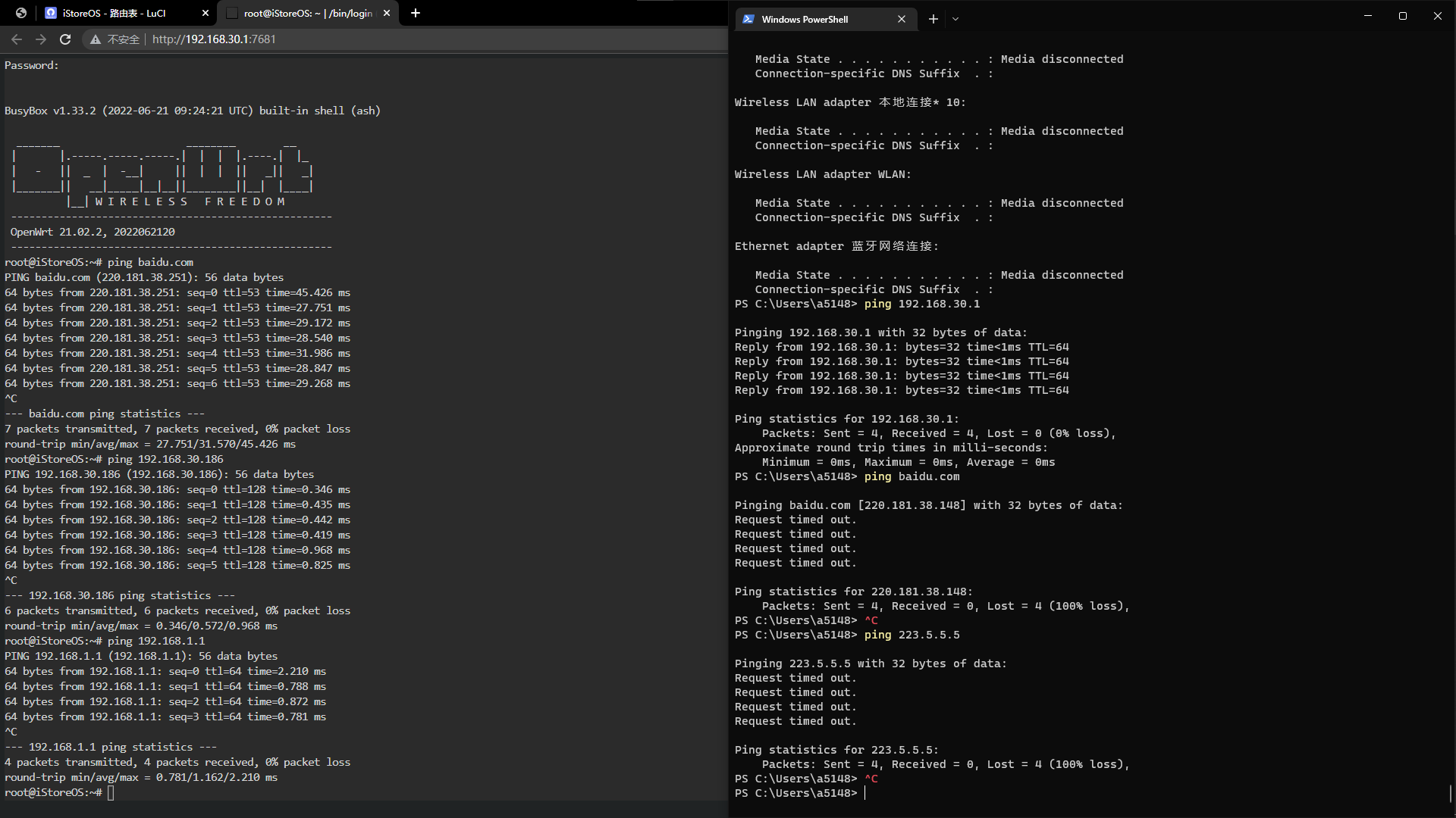 ping外网,上级路由,局域网内我的电脑都能通;但我的电脑就只能ping通iStore路由器,上级路由和外网都ping不通