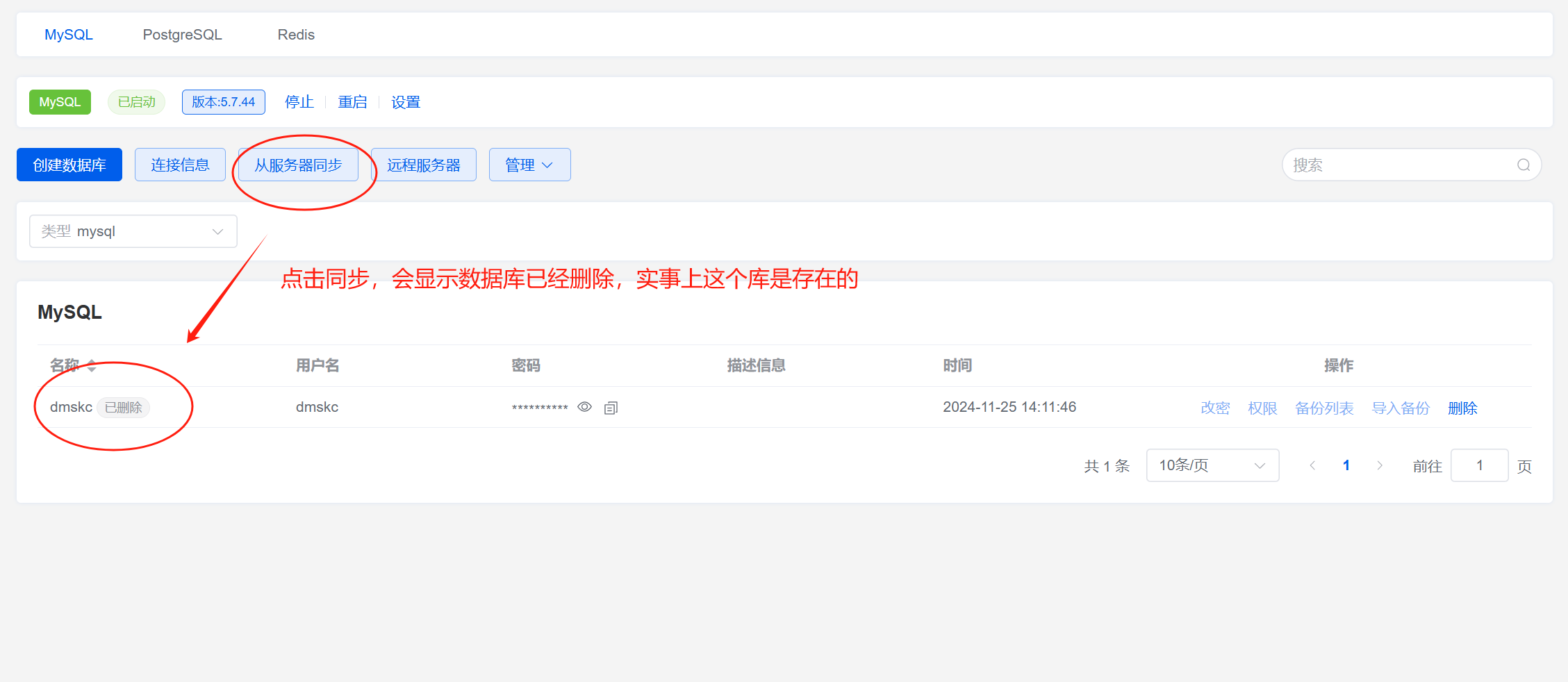 就像是面板对 MySQL 的容器失去了连接管理。