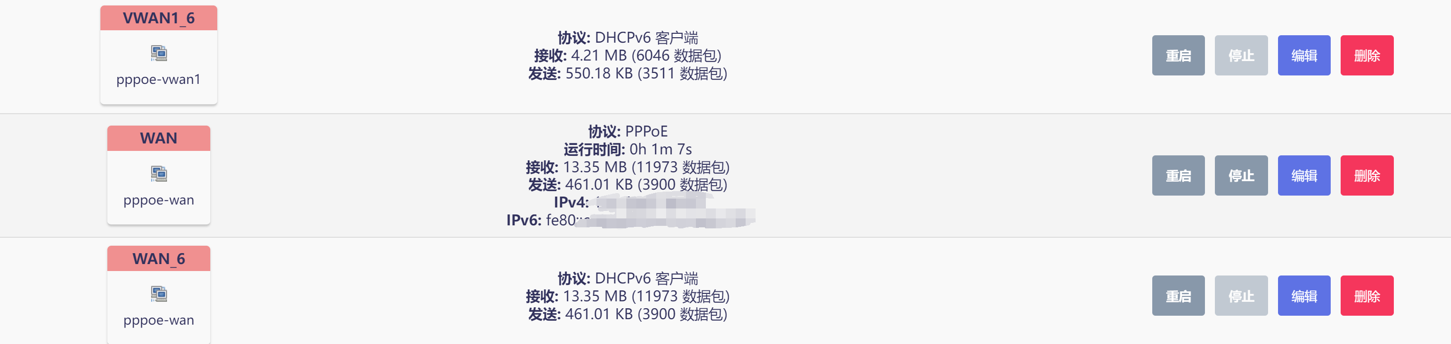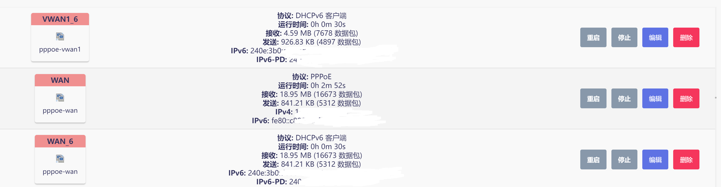 如题,接口查看拨号成功,但是WAN_6没有ipv6地址,必须手动重启一次端口,才有ipv6地址和正常访问外网ipv6,不知是BUG还是我的设置问题。