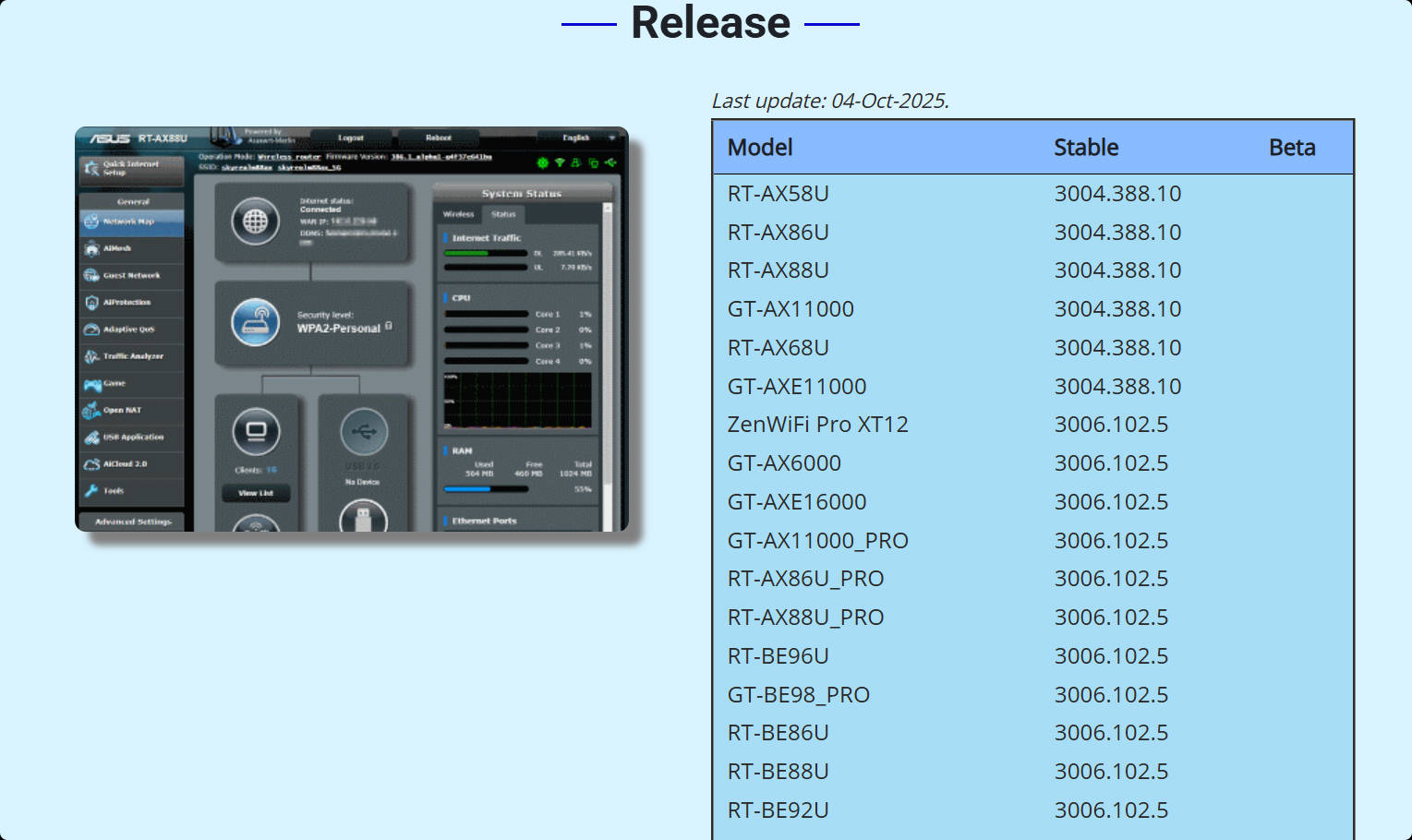 这次的固件来得有点晚,梅林原版的102.5版本在8月就已经发布,388.10在10月4日发布,分别支持下图的机型