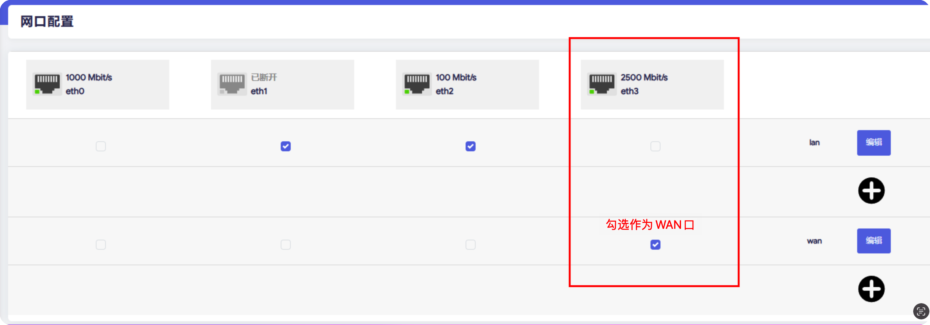 默认ETH2或者ETH3为2.5G口,所以你可以将任意一个设置成WAN口,右下角保存并应用即可。