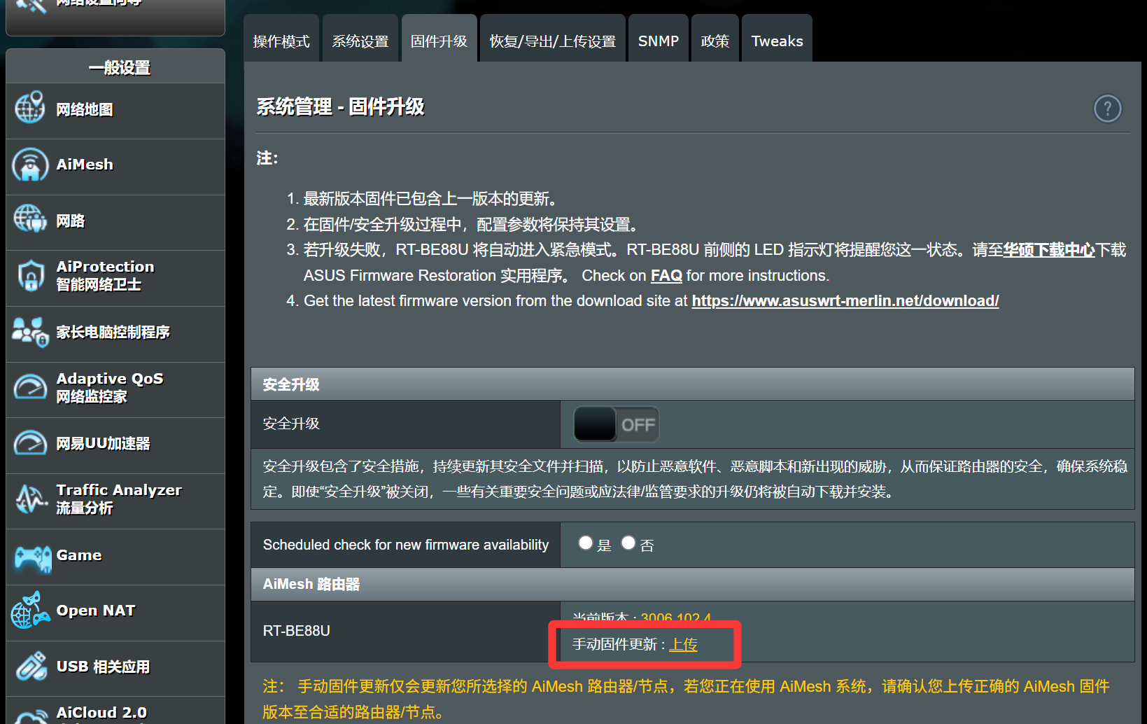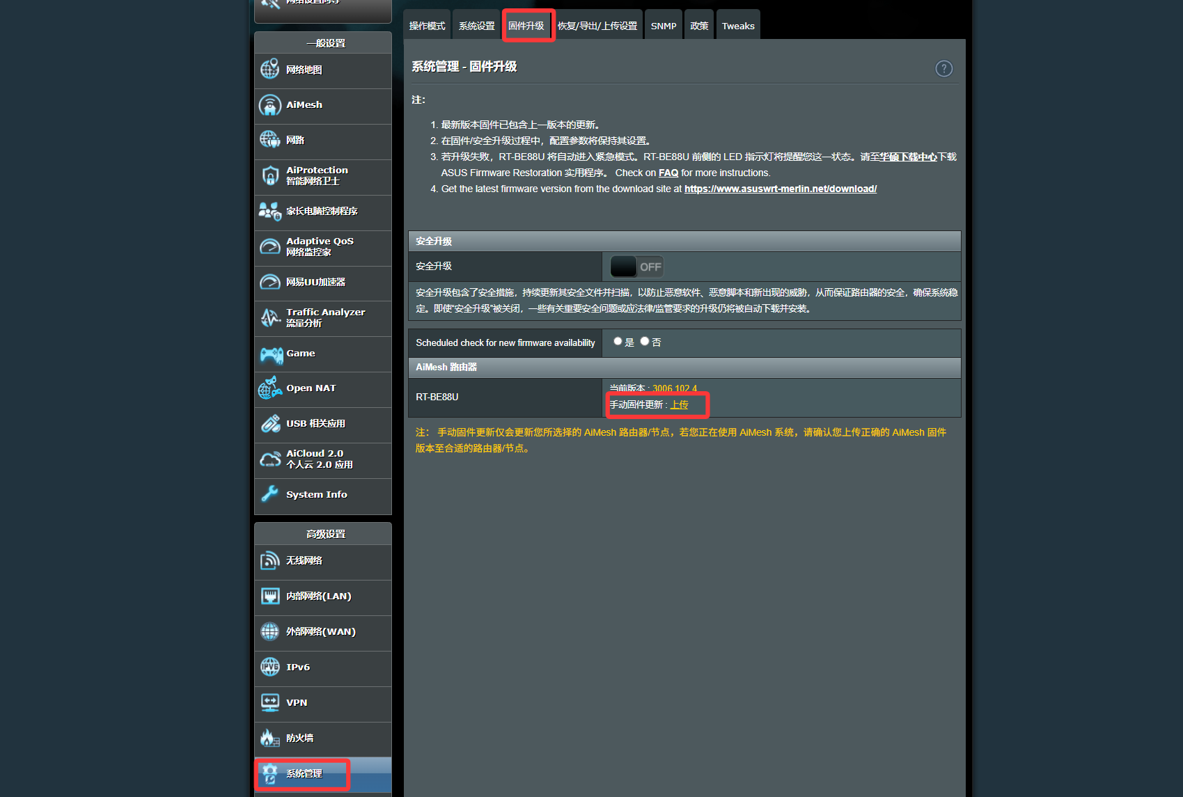 - 【系统管理】–【固件升级】,关闭自动固件升级+安全升级,底部【上传】选择下载的 ASUSGO 固件 文件;