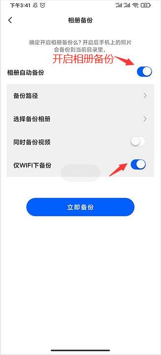 - 开启相册自动备份,还可以开启仅WIFI下备份;