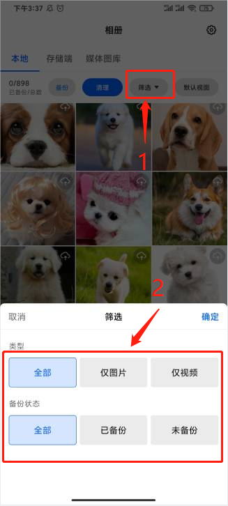 - 若要筛选已备份/未备份、照片/视频,点击【筛选】即可选择条件筛选;