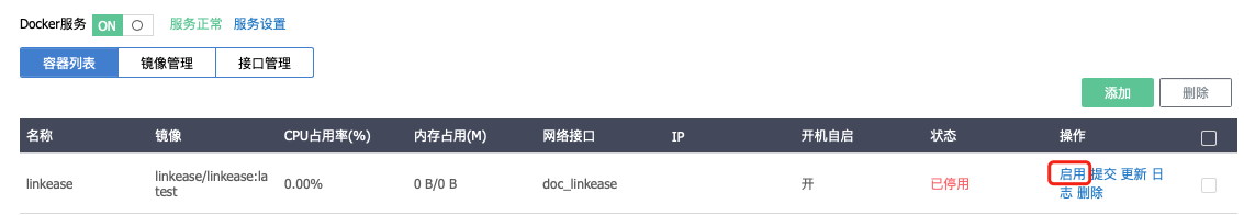 5.回到docker页面容器列表,点击“添加”,填写相关信息后保存后启用。