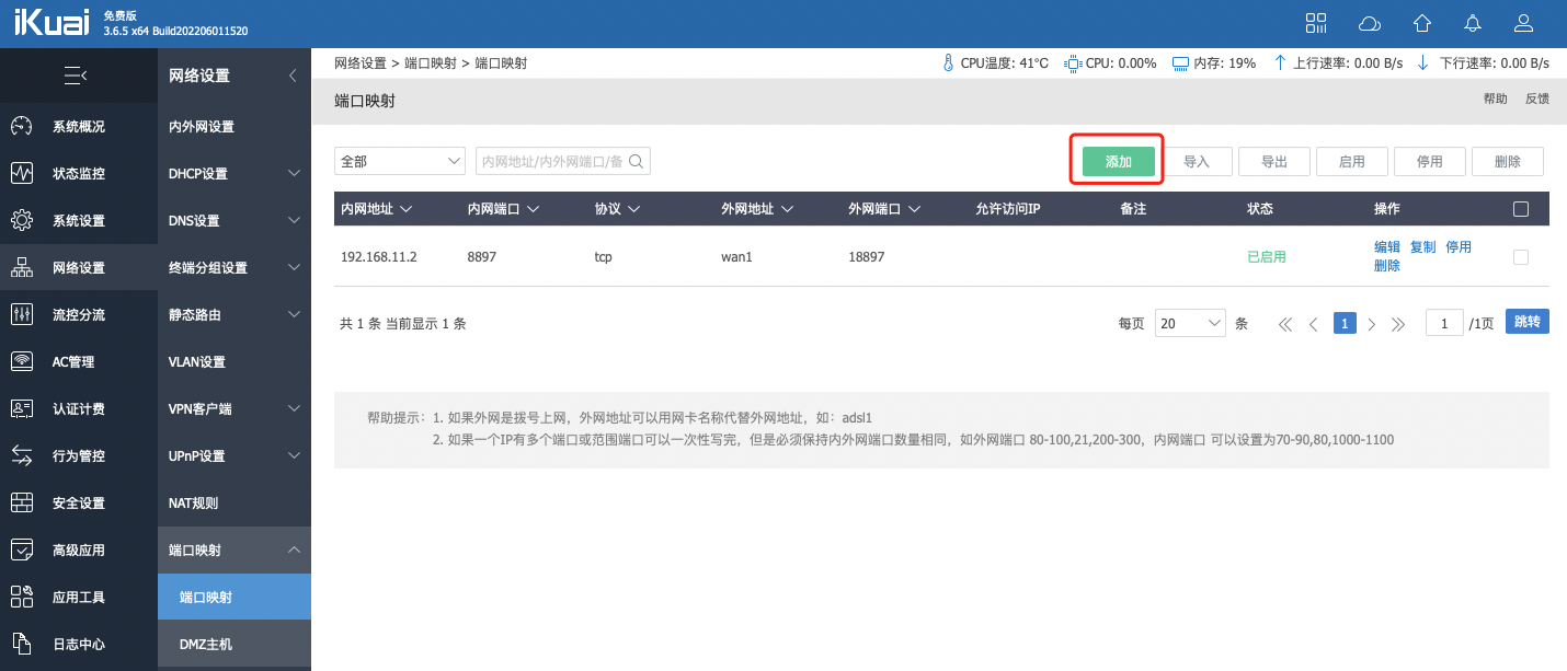 打开”网络设置-端口映射“,然后点添加,填入相关参数保存后启用。
