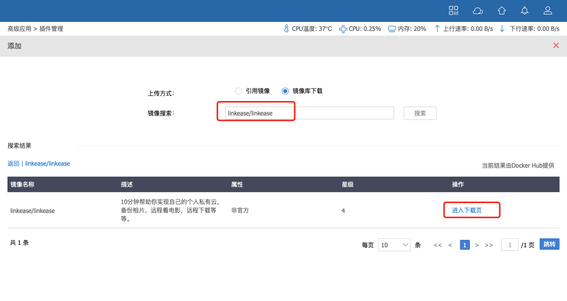 4.上传方式选择“镜像库下载”,然后镜像搜索“linkease/linkease”,在镜像列表选择中点击“进入下载页”,选择第一个最新的点击“下载”后等待下载完成即可;