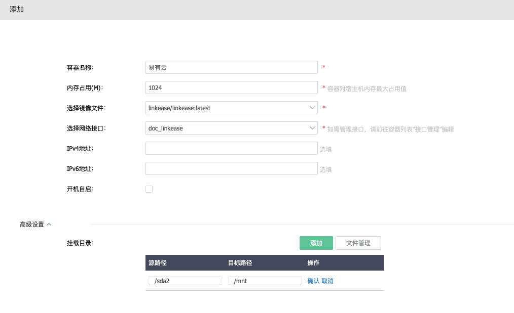 - 挂载目录:可将设备系统设置-磁盘管理-文件管理里的文件目录直接挂载到容器里的目录下。在设备文件管理里上传文件,会同步到容器里目标目录下。 源路径填写设备文件管理中目录路径,目标路径填写容器里的目录路径。 这里我选择将我路由器里的挂载路径 “/sda2” 目录挂载到容器里的 “/mnt” 目录下。