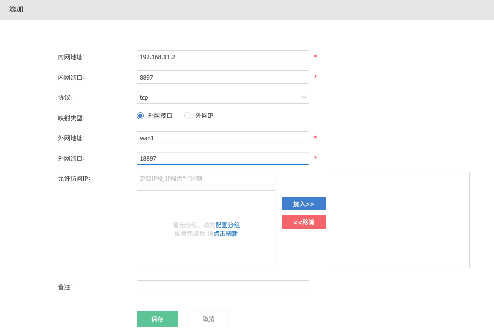 - 外网地址:当映射类型选择外网接口外网地址选择有公网IP的外网网口。当映射类型选择外网IP时外网地址填写公网IP地址。