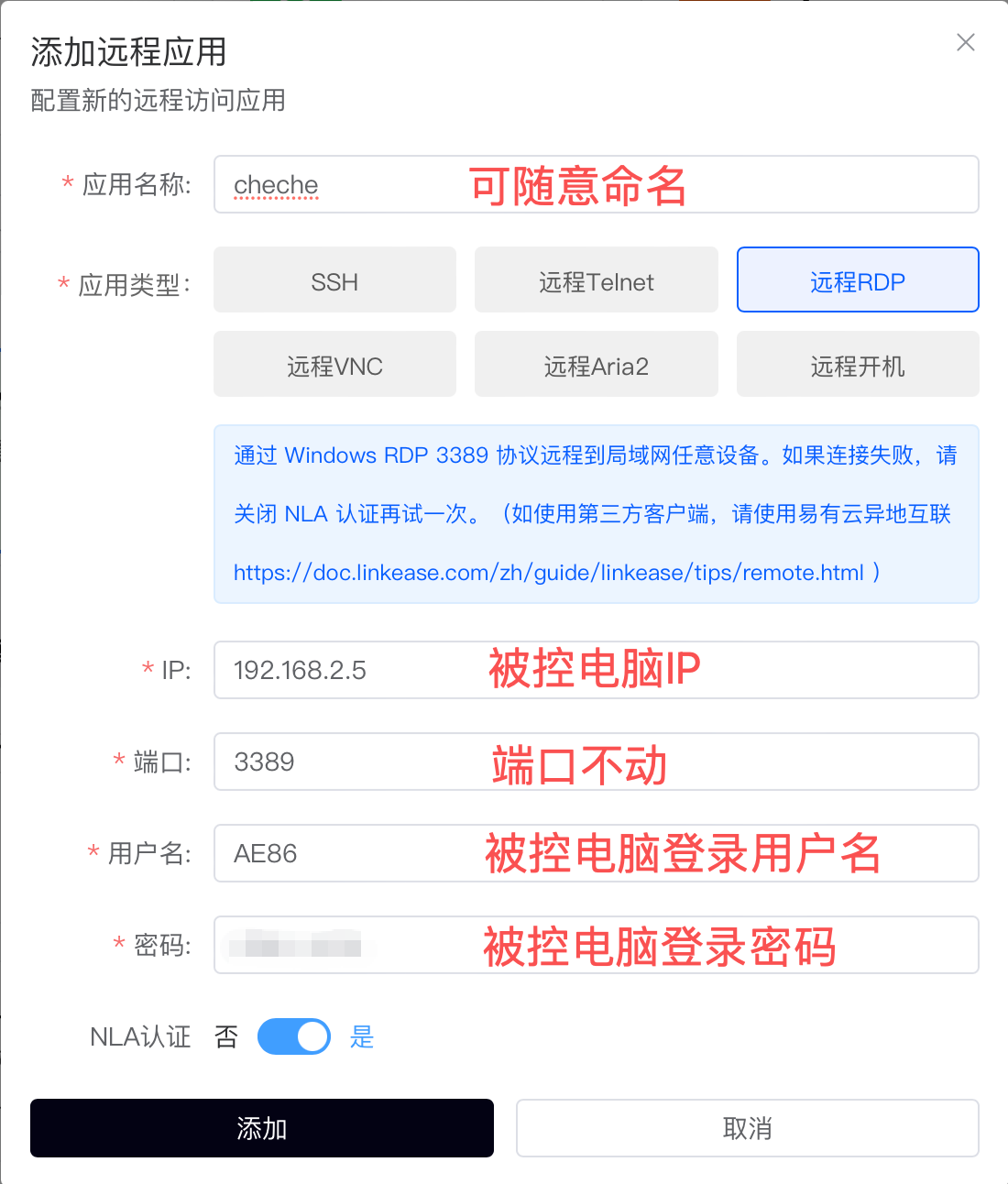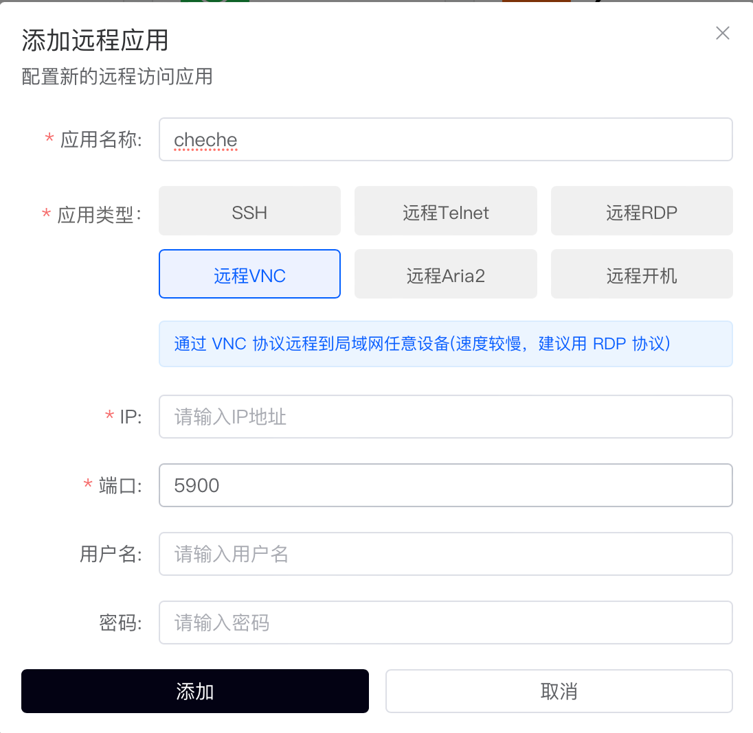 2.在ddnsto可用应用列表中点击添加远程RDP,填入被控电脑的IP,用户名,密码等信息。